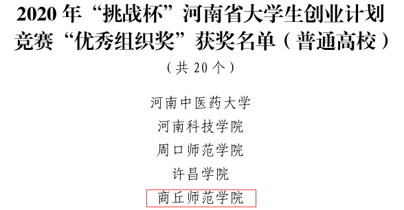 近日,共青团河南省委员会下发《关于发布2020年“挑战杯”河南省大学生创业计划竞赛优秀组织单位、获奖项目和优秀指导教师名单的通知》。我校在比赛中成绩优异,斩获金奖4项,银奖10项,铜奖12项,孙春志等4位老师获省级优秀指导教师,我校获连续5年获“优秀组织奖”。