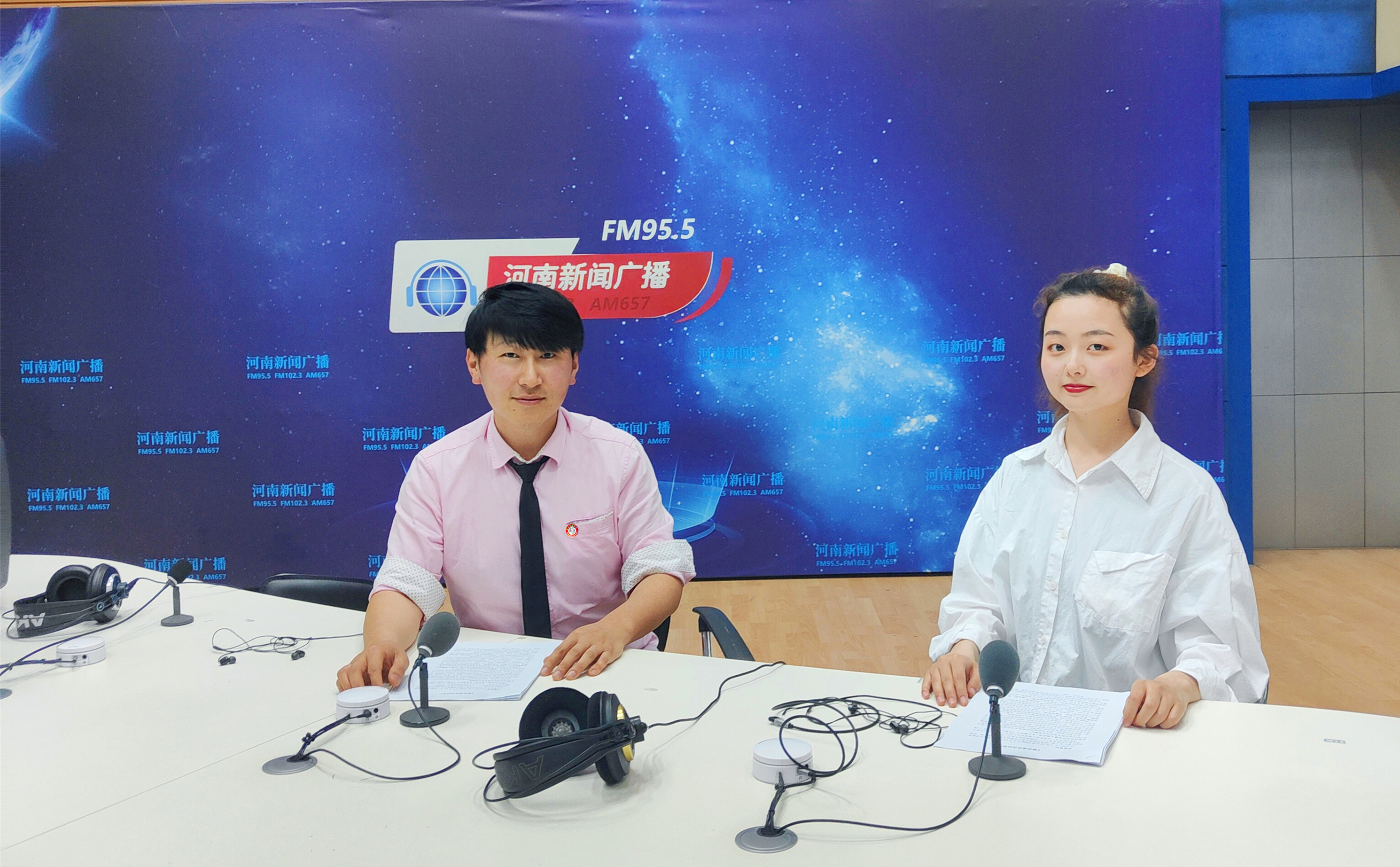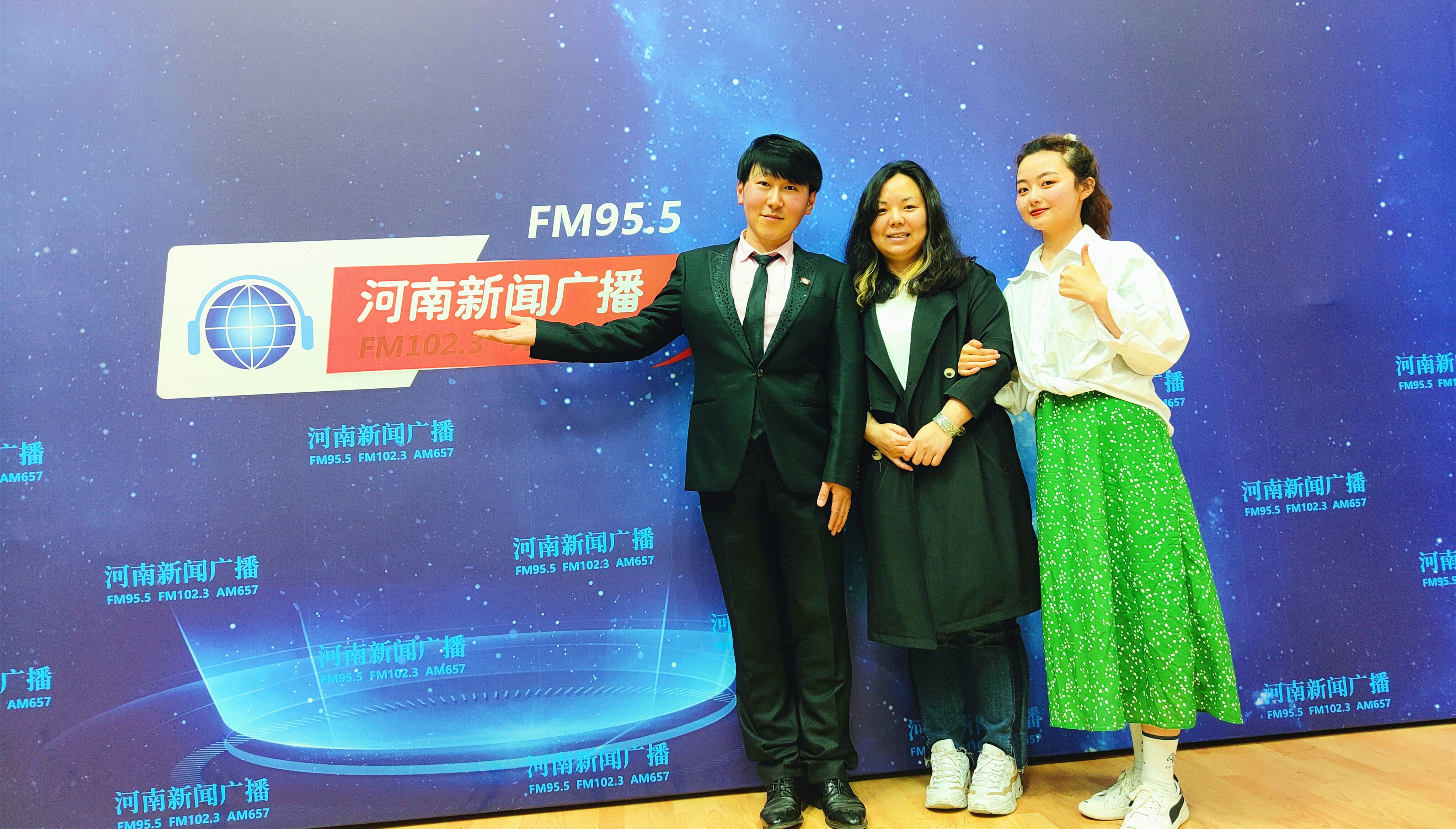 我校上报的由音乐学院编排的音画诗剧作品《梨花盛开西柏坡》成功入围,指导教师张云峰和参演学生吴雨潇于5月15日来到河南新闻广播直播间,接受了相关访问。
