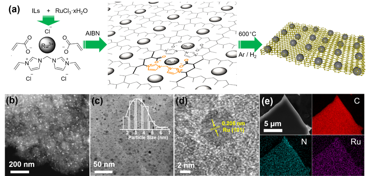 图(a)离子液体原位限制聚合制备Ru基电催化剂的示意图;(b)HAADF-STEM图像;(c)TEM图像(插图:Ru NPs的粒度分布);(d)HRTEM图像;(e)SEM图像和EDX图谱。