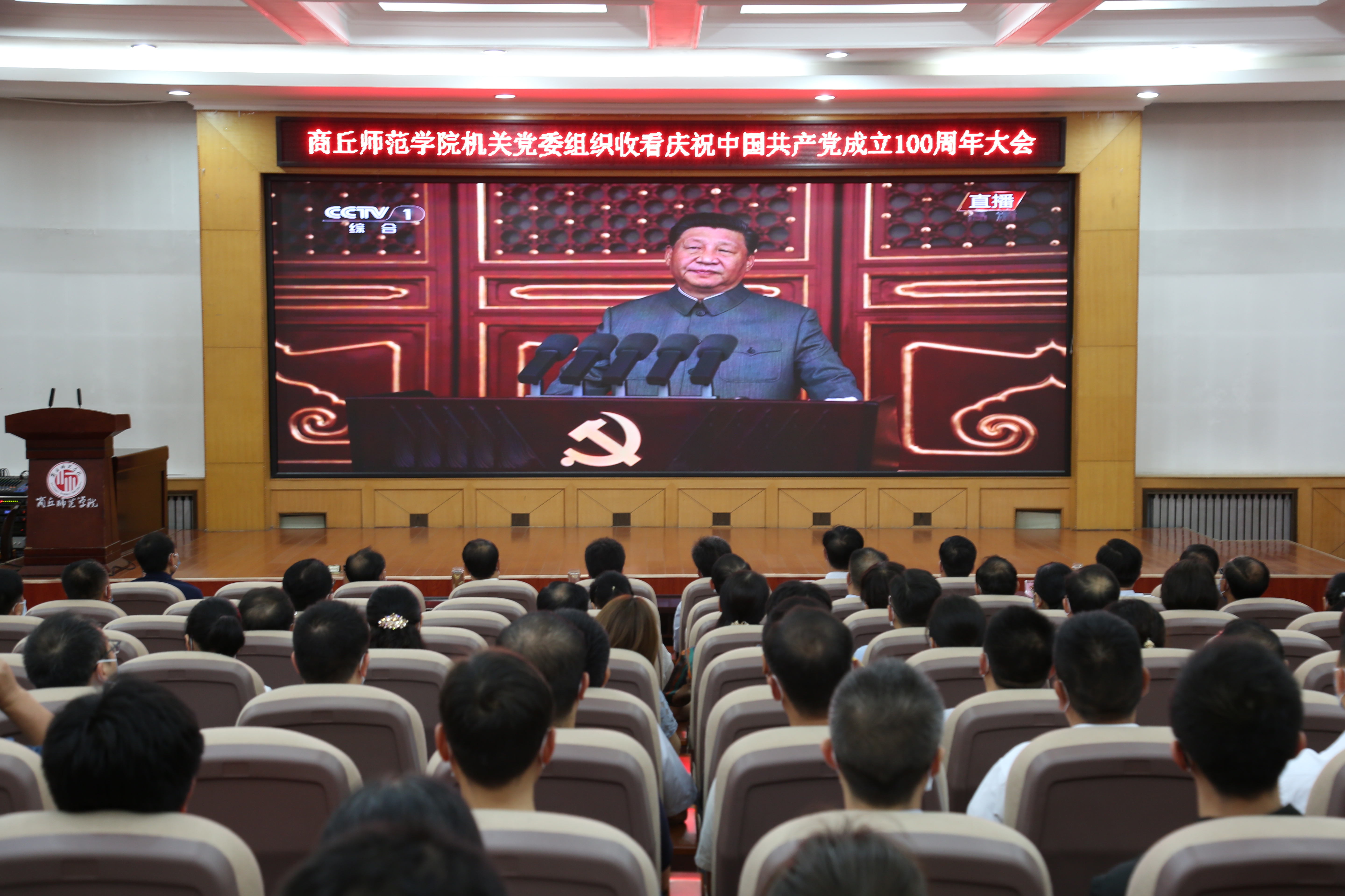 百年大党风华正茂,初心不改再启征程。7月1日上午,庆祝中国共产党成立100周年大会在北京隆重举行。中共中央总书记、国家主席、中央军委主席习近平发表重要讲话。我校高度重视,精心组织,校党委书记司林胜、校长陈向炜等校领导和机关党委广大党员在梁园校区归德楼收看了大会实况直播。各基层党委、党总支分别组织师生党员收听收看。观看直播盛况后,大家纷纷表达了对建党100周年的祝福之情和对中国共产党的感恩之情。大家纷纷表示要更加紧密地团结在以习近平同志为核心的党中央周围,牢记初心使命,坚定理想信念,传承红色基因,赓续红色血脉,以昂扬姿态谱写新时代中原更加出彩的绚丽篇章。
