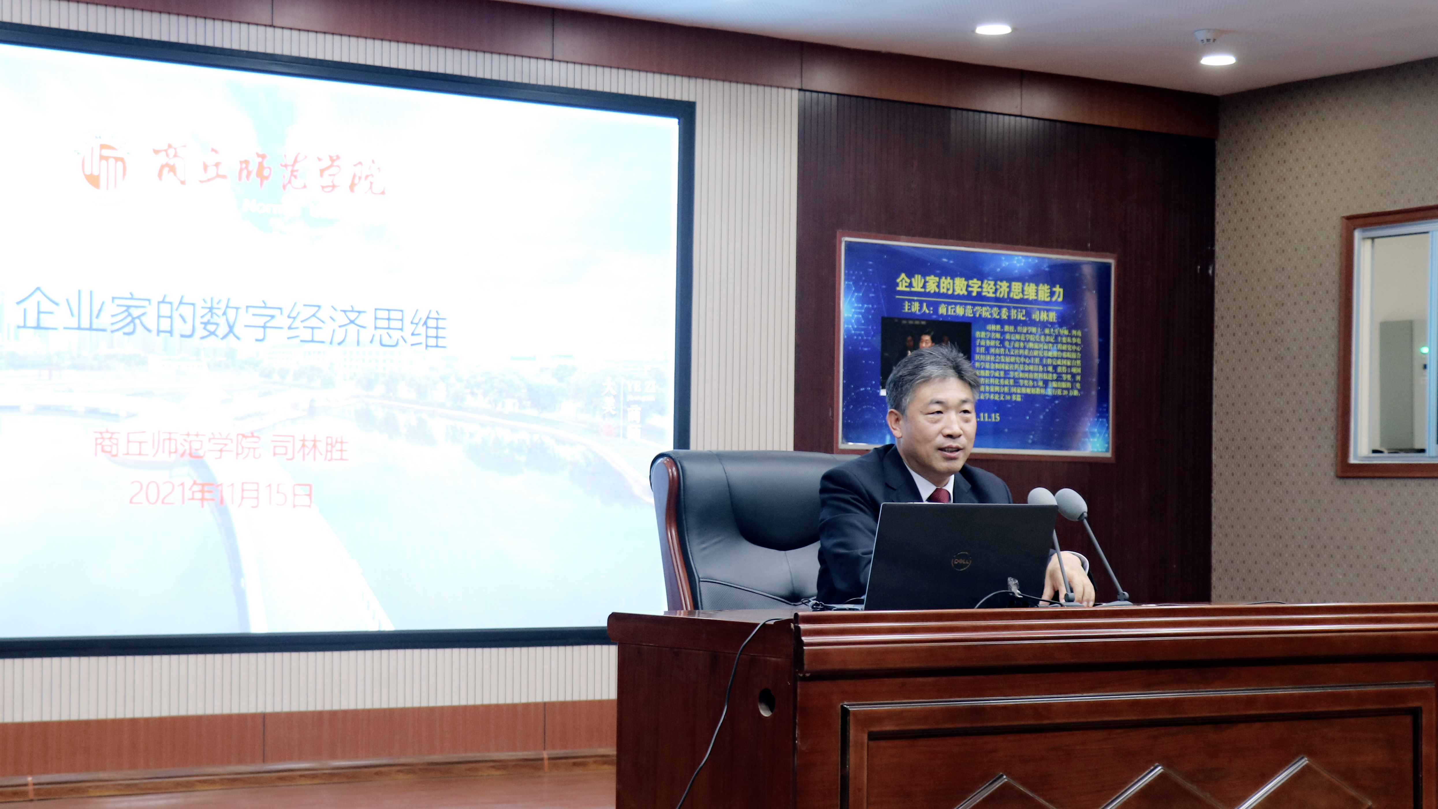 11月15日下午,我校党委书记司林胜应邀为商丘市企业家大讲堂作《企业家的数字经济思维能力》报告。市领导李国胜、王全周、王金启、王玉娟、曹月坤、刘明亮,校领导陈向炜、吴金山、徐茂田出席主会场。商丘市直有关单位主要负责同志、部分企业家代表、我校有关学院负责同志参加主会场。各县(市、区)参会人员在分会场收听收看报告会。报告会由副市长曹月坤主持。