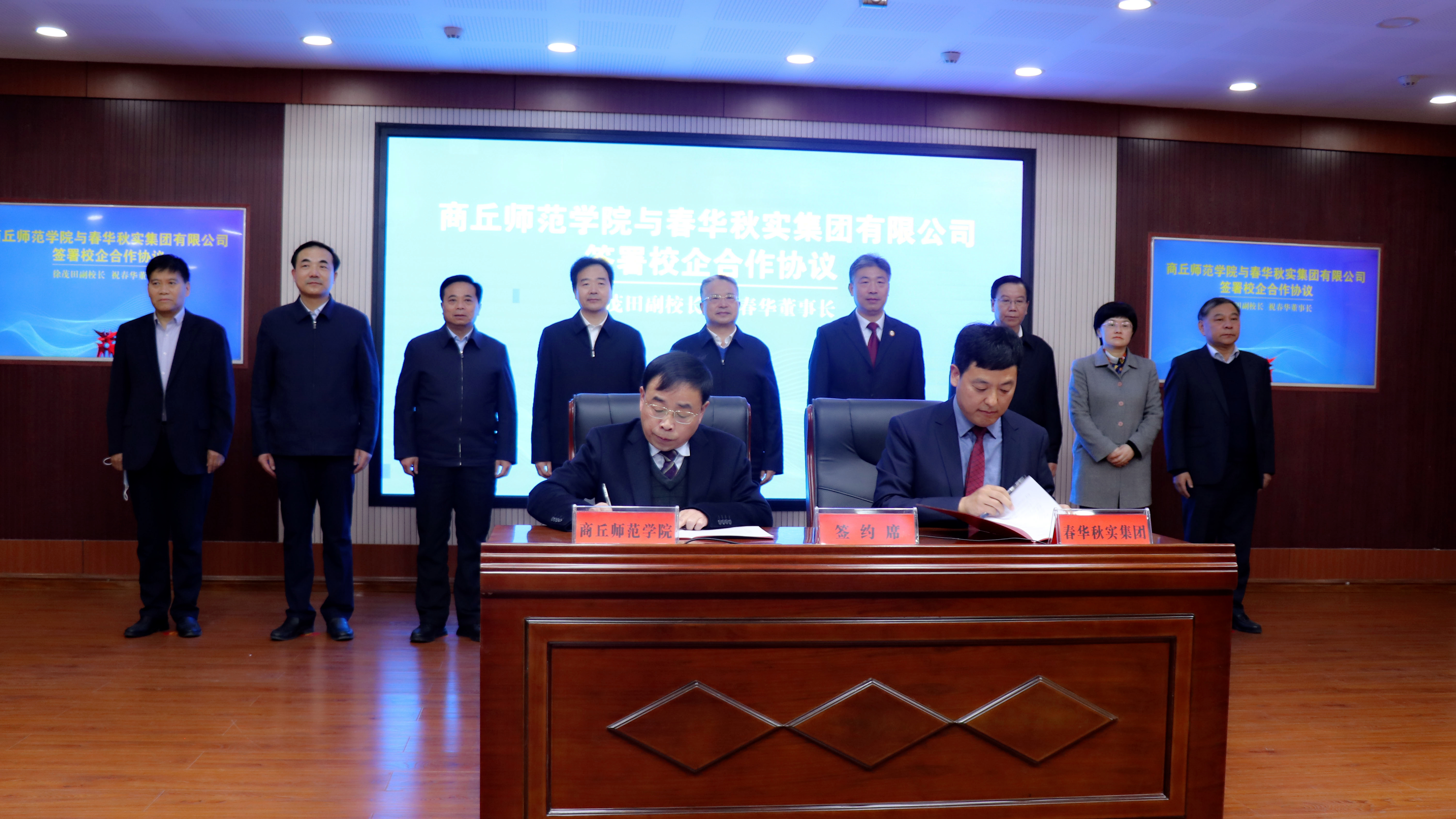 11月15日下午,我校与春华秋实集团合作协议签字仪式在梁园校区三商楼企业家大讲堂举行,市领导李国胜、王全周、王金启、王玉娟、曹月坤、刘明亮,校领导司林胜、陈向炜、吴金山、徐茂田出席签字仪式。商丘市直有关单位主要负责同志、部分企业家代表、我校有关学院负责同志参加签字仪式。签字仪式由市委常委、宣传部部长王全周主持。