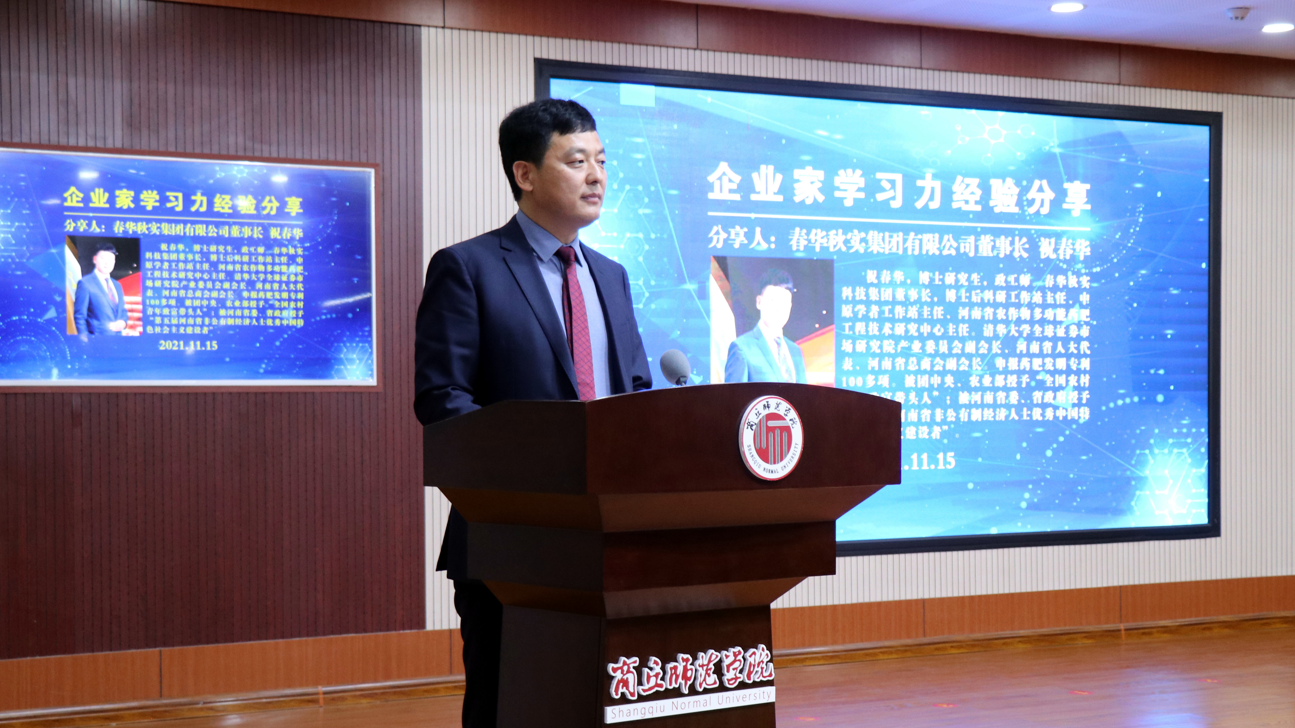 捐赠仪式结束后,在随后进行的“企业家大讲堂”企业家分享环节,祝春华就“企业家的学习力”进行了分享。他从市委书记李国胜提出的“什么是企业、企业家和企业家精神”“如何凝聚弘扬商丘企业家精神”“如何在‘两个确保’大局中展现商丘企业家作为”等企业之问,阐述了学习对企业家精神的重要性,以及学习成果在春华秋实科技集团的转化与应用,在精准服务“三农”、农业高质高效增产增收、助力乡村振兴和回报社会等方面的具体做法。