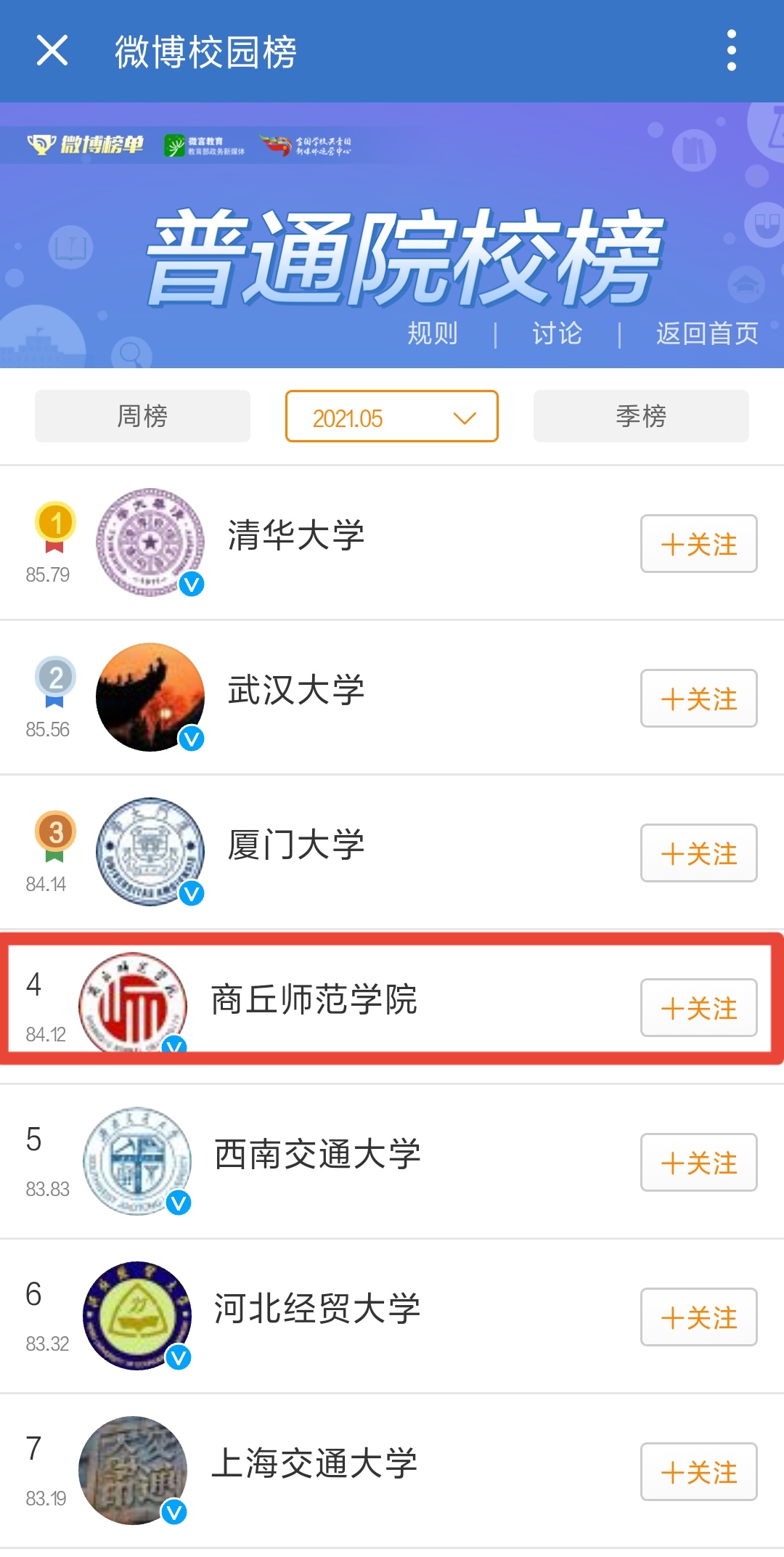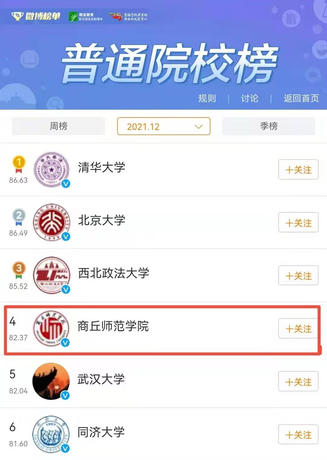 2021年,我校官方微博原创作品发布量14972条,阅读量总计31990多万,全年单日阅读量全部超过10万加。在由新浪微博榜单、教育部官方微博“微言教育”和全国学校共青团新媒体运营中心联合发布的“微博校园榜”月度排名中,我校官方微博在全国高校官方微博排名中6次位居前十行列,其中2021年5月和12月均位居全国榜单第4位。