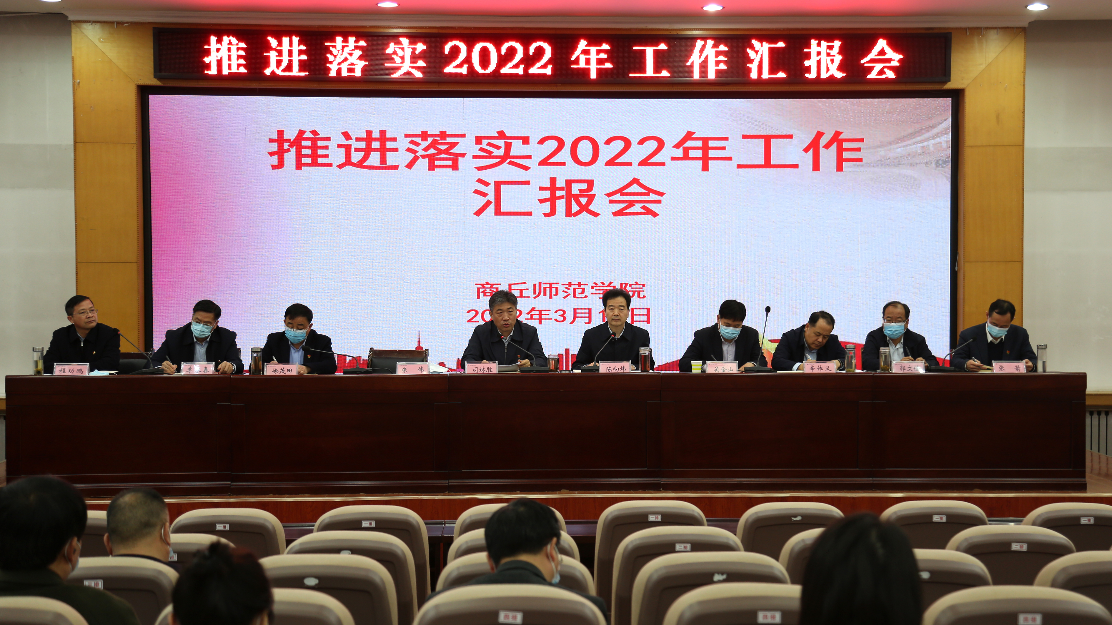 3月17日下午,我校在梁园校区归德楼113会议室召开党群行政教辅部门推进落实2022年工作汇报会,校领导司林胜、陈向炜、朱伟、吴金山、徐茂田、辛作义、李永春、郭文佳、程功鹏、张箭出席会议,党群行政教辅各部门负责人、各学院党委书记参加会议,会议由校长陈向炜主持。