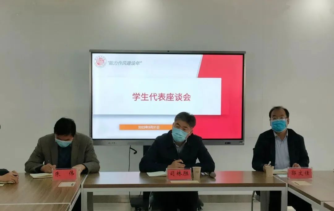 3月31日,为深入推进“能力作风建设年”活动,及时回应师生关切,我校在梁园校区学生事务服务中心召开学生代表座谈会,校党委书记司林胜、党委副书记、工会主席朱伟、副校长郭文佳出席会议,党政办公室、宣传部、教务处、学生处、保卫处、校团委、信息化管理中心、图书馆、后勤服务中心等职能部门负责人,22名来自不同学院、不同年级的学生代表参加座谈会,学生处处长王晓征主持座谈会。