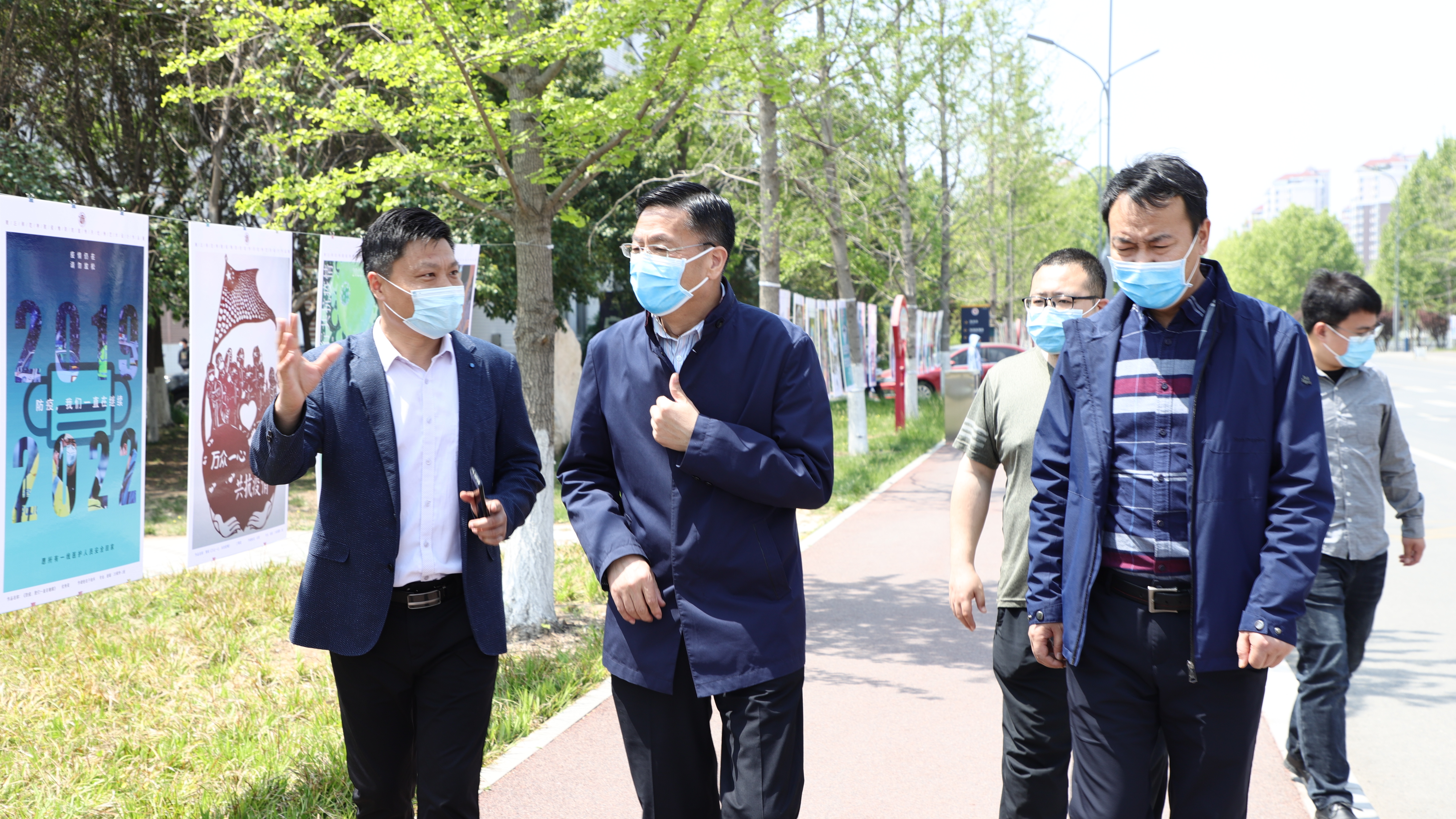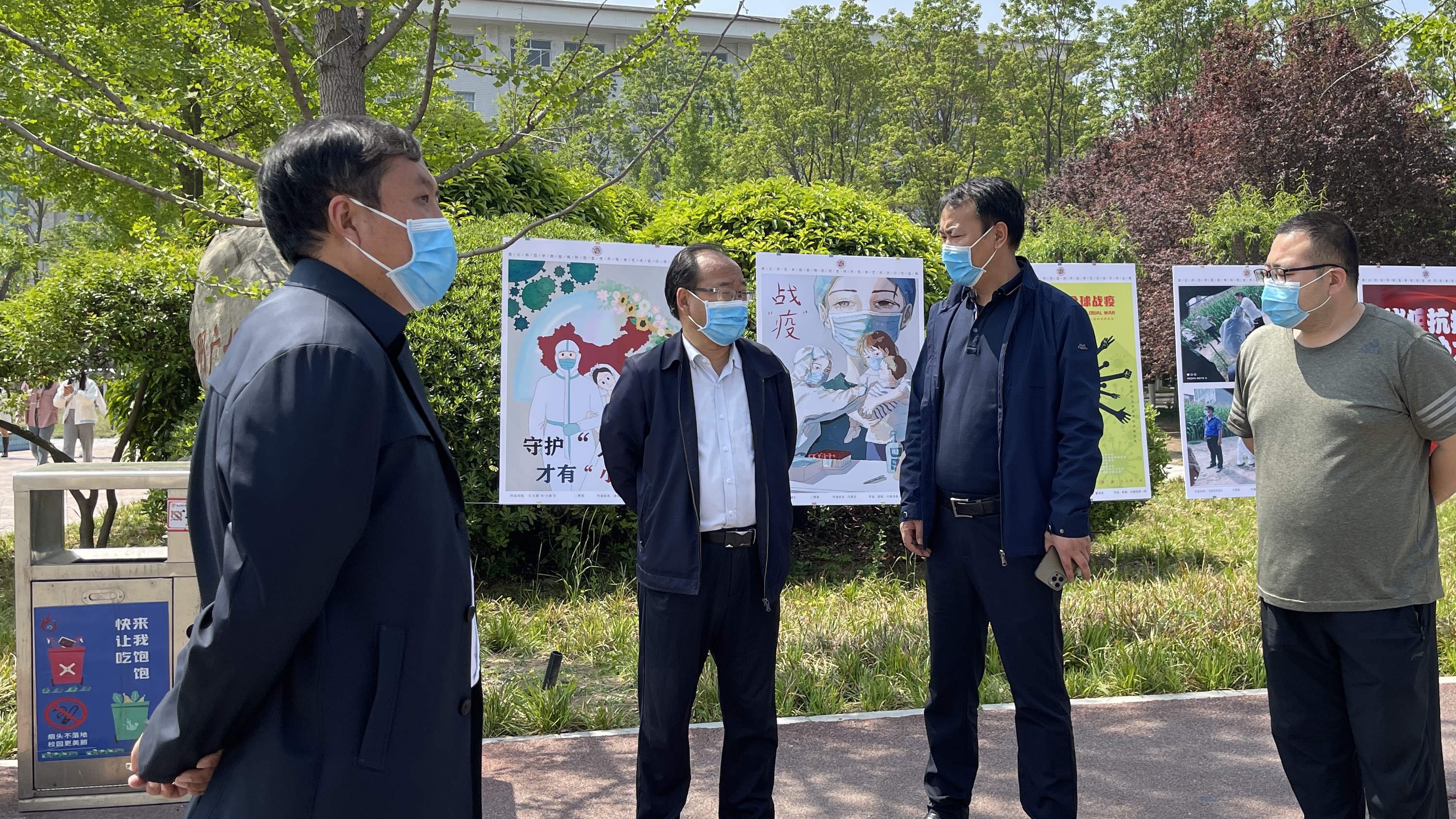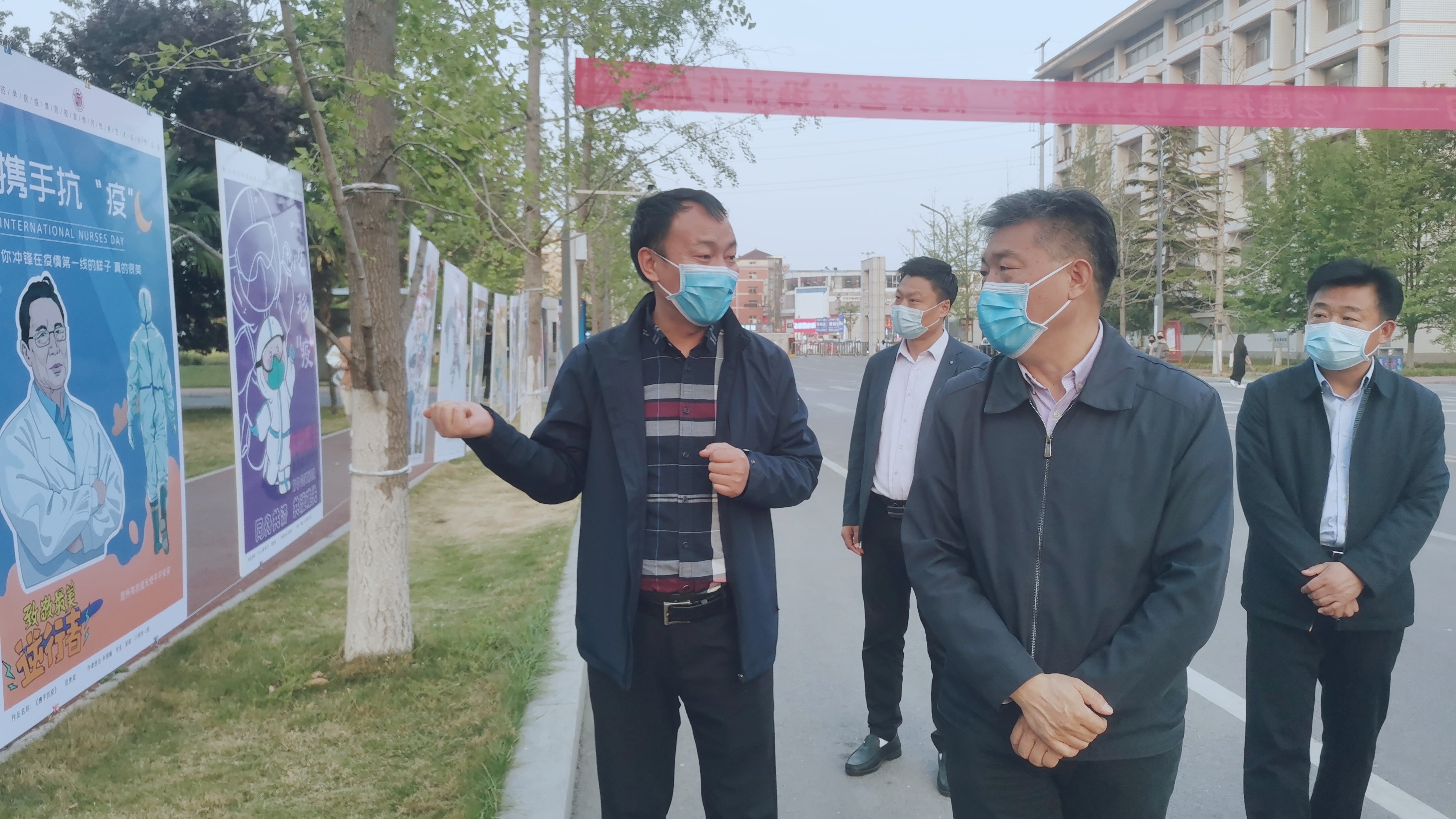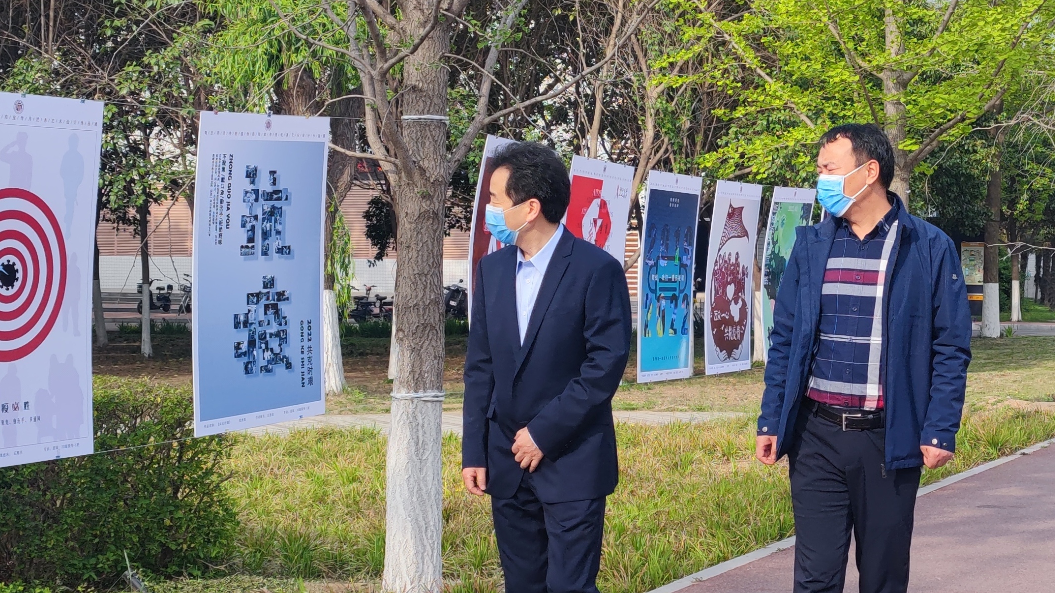 4月19日,我校在梁园校区启明广场、大成路两侧举办疫情防控宣传月之“艺起携手 设计抗疫”优秀艺术设计作品展,学校党政领导及各防疫专班负责人参观了展览。