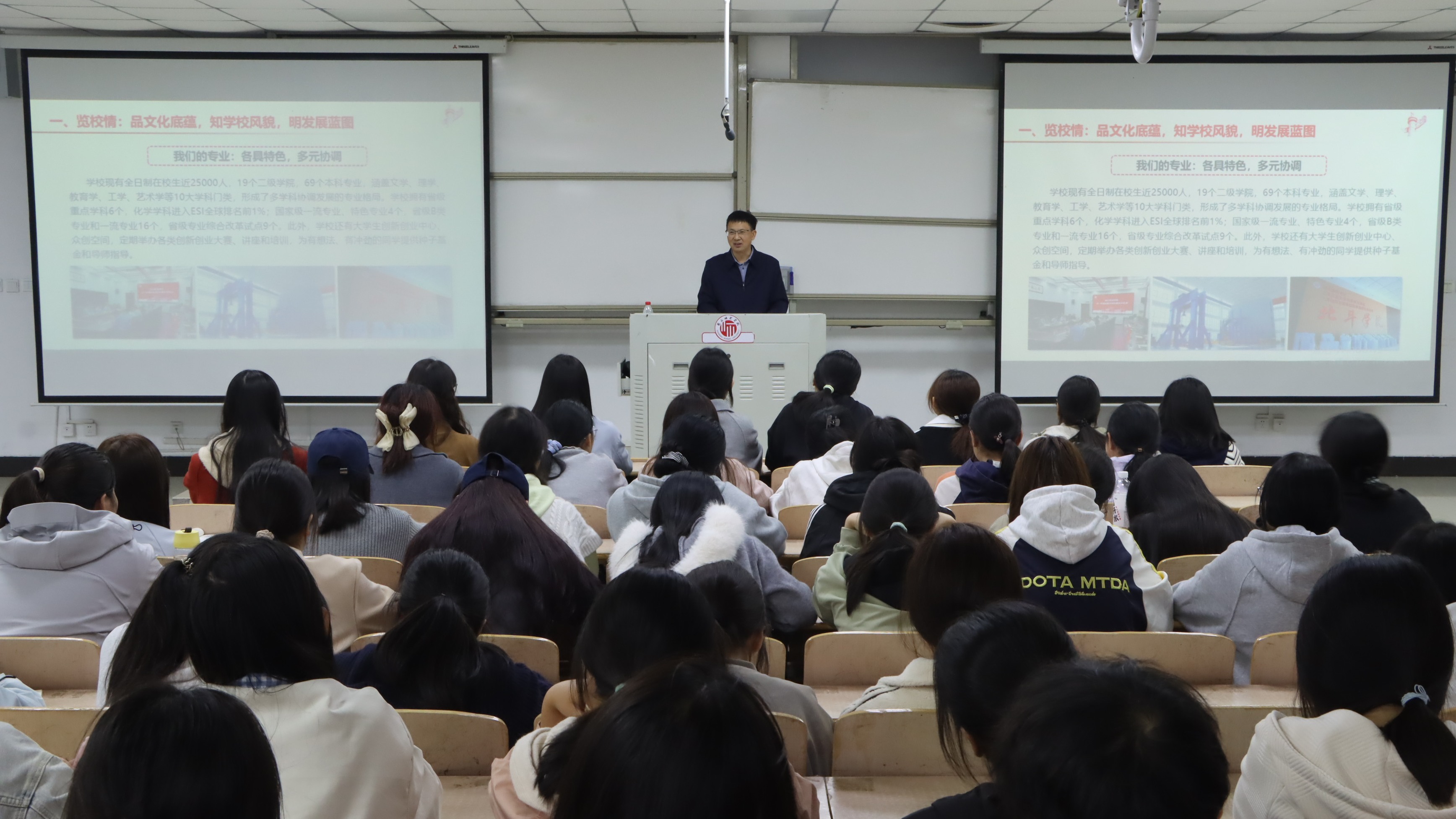 10月13日,校长陈向炜为化学化工学院2025级新生讲授一堂富有感染力的思政课。陈向炜以“览校情”为引,从校史沿革出发,细数学科、师资、科研等发展历程,展示校园标志性建筑、特色文化活动及未来规划,让新生直观了解学校风貌,明晰学校发展蓝图,激发新生的归属感与认同感。围绕“辨差异”,陈向炜结合自身经验剖析大学与高中在学习、管理、目标上的核心差异,强调大学是自主探索舞台,新生需从被动接受转向主动规划,合理安排时间、尝试学科竞赛与科研,以开放心态迎新阶段。“践行动”部分,陈向炜勉励同学以“铸魂立心”为根本,坚定信念、厚植家国情怀;以“筑成长根基”为目标,学好专业、锤炼能力;以“绘青春华章”为追求,在学术与实践中找准定位,将个人成长融入校发展与时代需求。