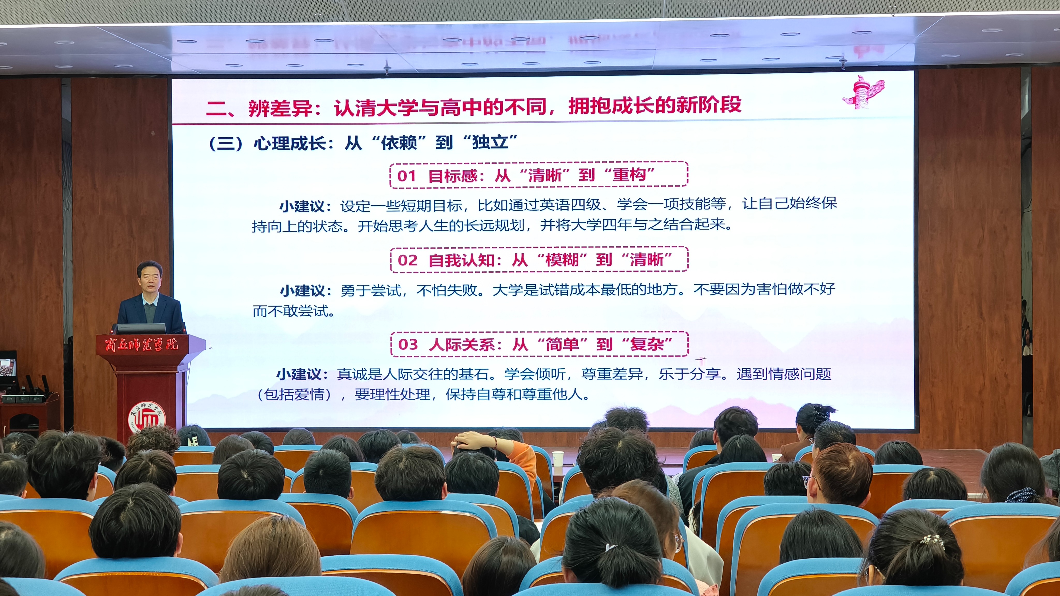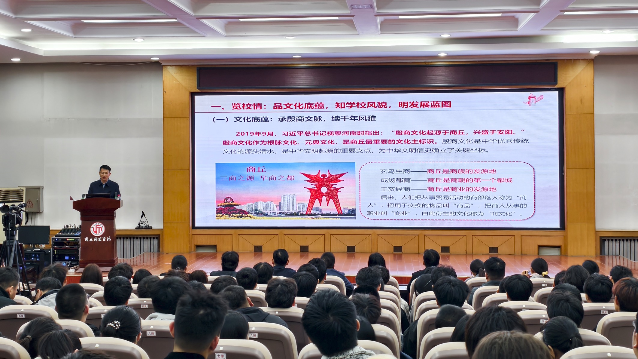 10月10日晚,校党委副书记刘国庚为人文学院2025级新生讲授了一堂内容丰富、思想深刻的思政课。刘国庚围绕“览校情、辨差异、践行动”三个方面层层展开,用“玄鸟生商”故事切入,阐释殷商文化与学校120年师范传承,介绍学校“申硕”攻坚与“两步走”战略蓝图,寄语新生“与商师共赴高水平大学新征程”,激励新生以校为荣,增强对学校的认同感与归属感。随后,他对比高中与大学在学习、生活、心理、发展四维度差异,送出“时间管理四锦囊”,提醒新生“今日事今日毕”。刘国庚提出“六个学会”成长路径,带领全场重温“爱国三问”,号召青年“把个人坐标系进民族复兴的大棋盘”。