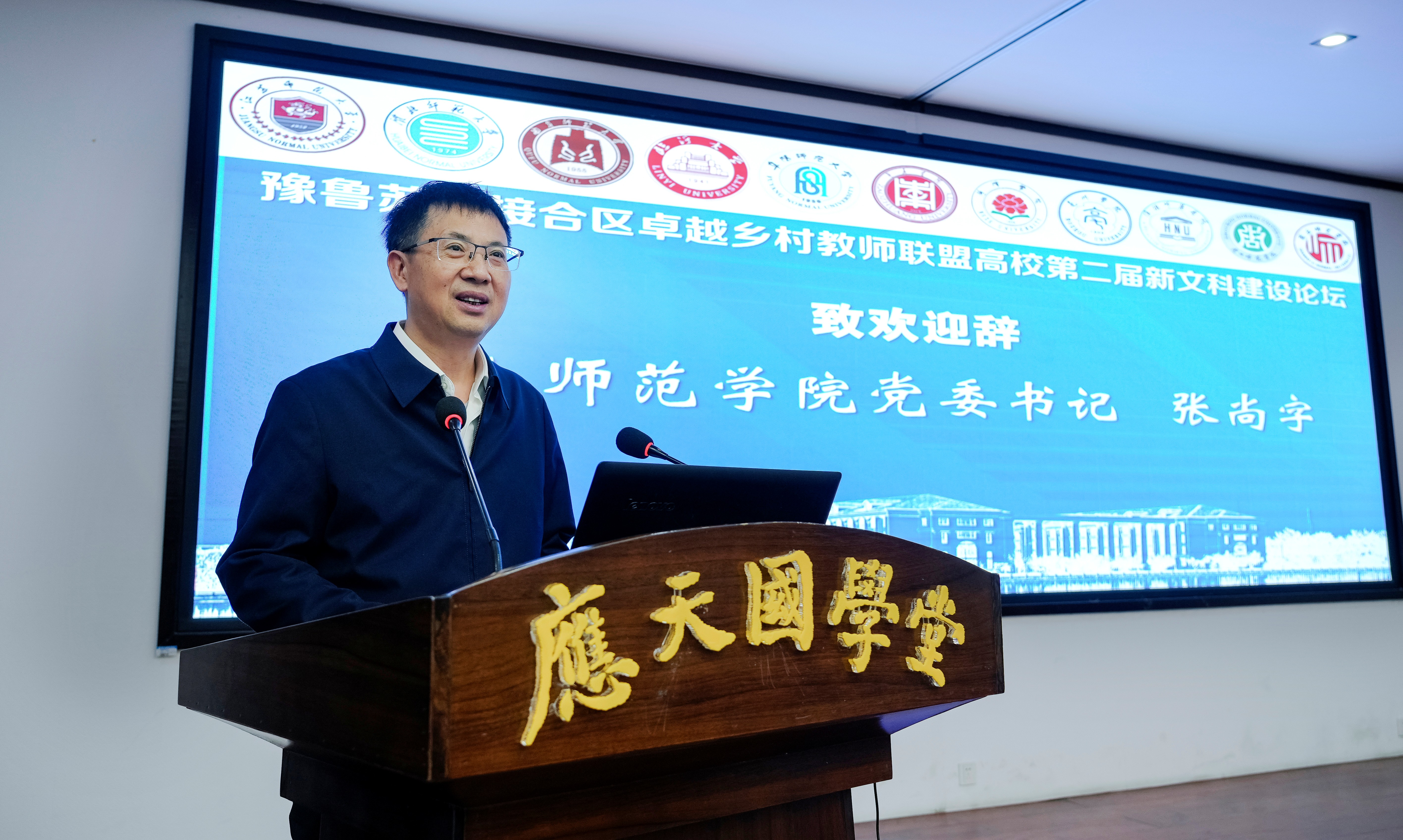 10月17日,豫鲁苏皖接合区卓越乡村教师联盟高校第二届新文科建设论坛在我校梁园校区成功举办。来自豫鲁苏皖接合区13所联盟高校教务部门负责同志、专家学者代表,华南师范大学等高校特邀嘉宾等50余人齐聚一堂,围绕人工智能赋能新文科建设相关议题交流研讨。我校党委书记张尚字、校长陈向炜出席论坛,论坛第一阶段由副校长韩桂玲主持,第二阶段由江苏师范大学教务处闫长春处长、梁靓副处长主持。