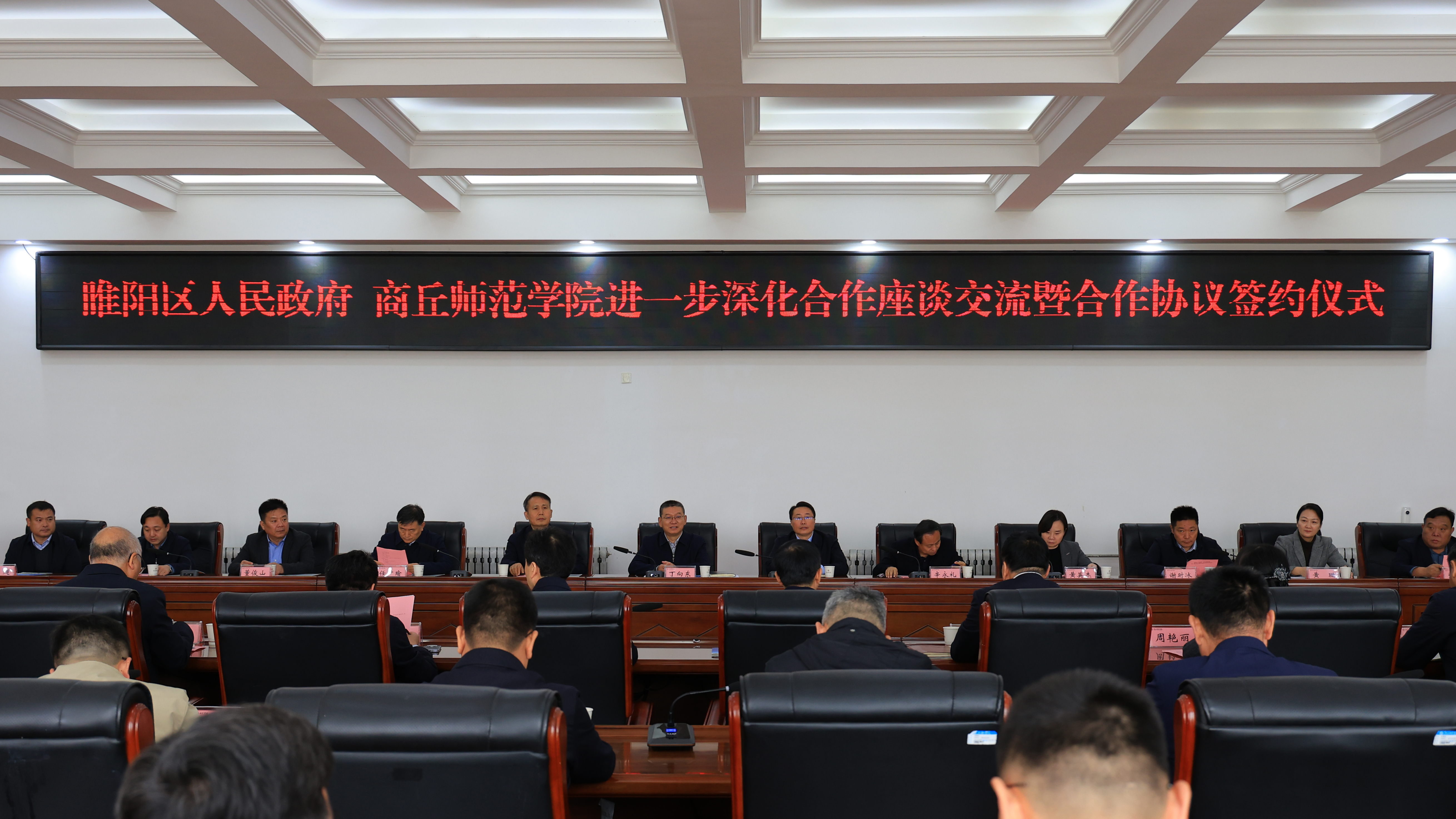 10月22日,我校与睢阳区人民政府举行进一步深化合作座谈交流暨合作协议签约仪式。我校党委书记张尚字、校长陈向炜、校党委副书记吴金山、副校长翟滨,商丘市睢阳区委书记丁向东、区长李长东出席会议。我校有关职能部门,睢阳区委、区人民政府,睢阳区区直单位负责同志参加签约活动。吴金山主持会议。