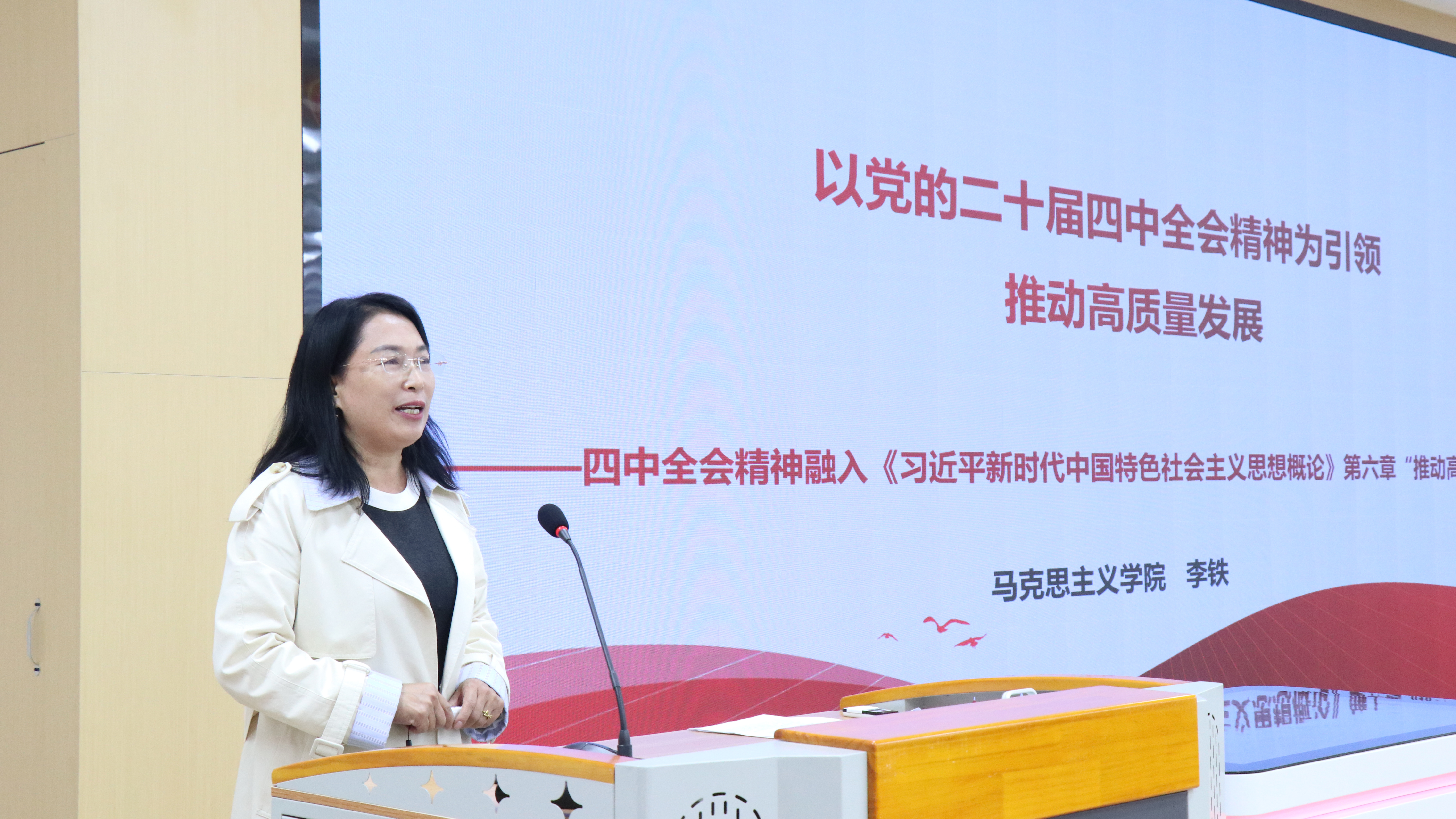 马克思主义学院党委书记龚志宏以《在接续奋斗中谱写中国式现代化新篇章》为题,对党的二十届四中全会精神进行了解读辅导;马克思主义学院教师李铁以《以党的二十届四中全会精神为引领 推动高质量发展》为题,结合《习近平新时代中国特色社会主义思想概论》第六章推动高质量发展教材内容,从融什么、融那里、怎么融三个方面进行了说课展示。马克思主义学院教师商诗娴以《向新而行:系统把握发展新质生产力的路径》为题进行了讲课展示。