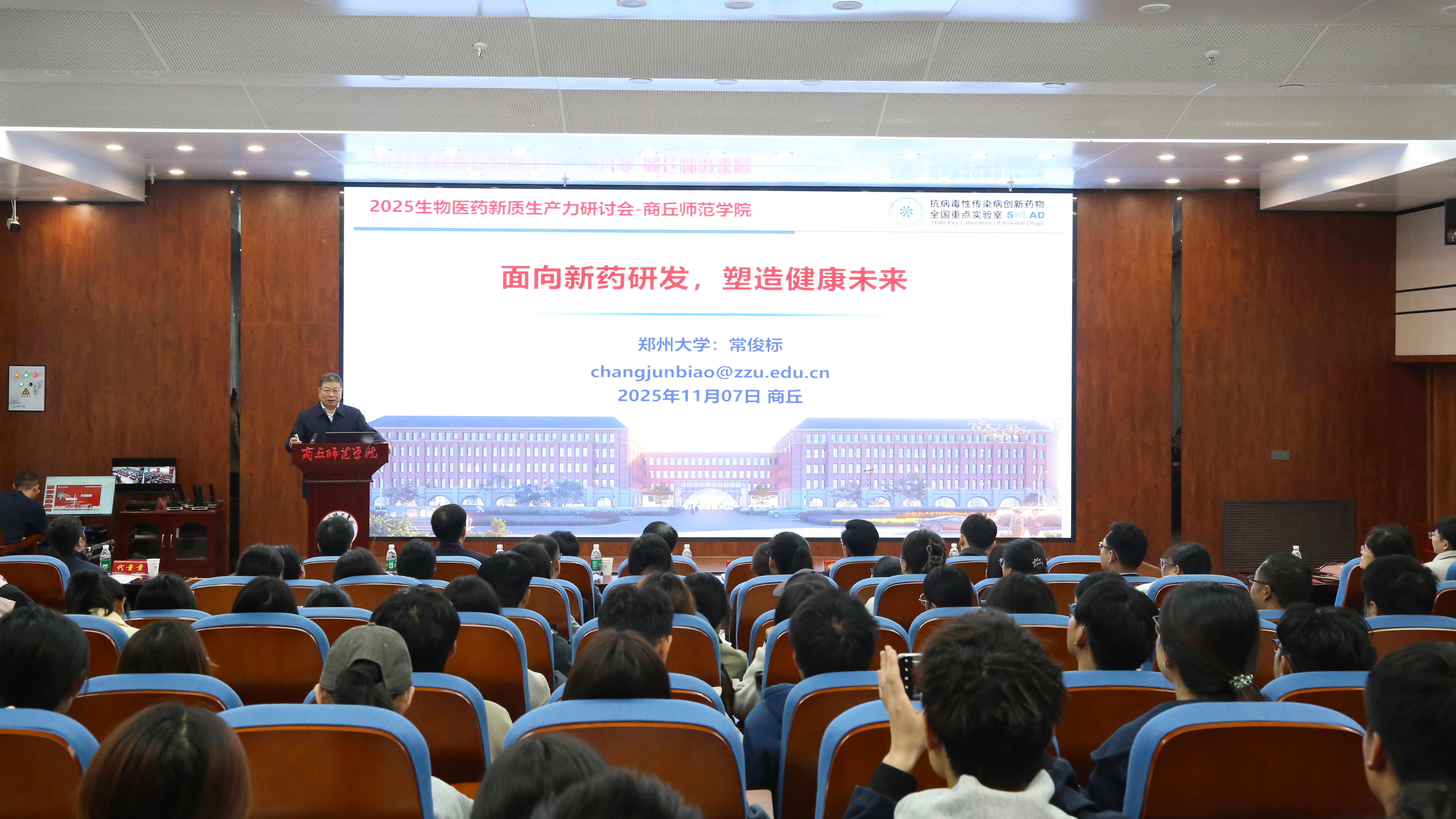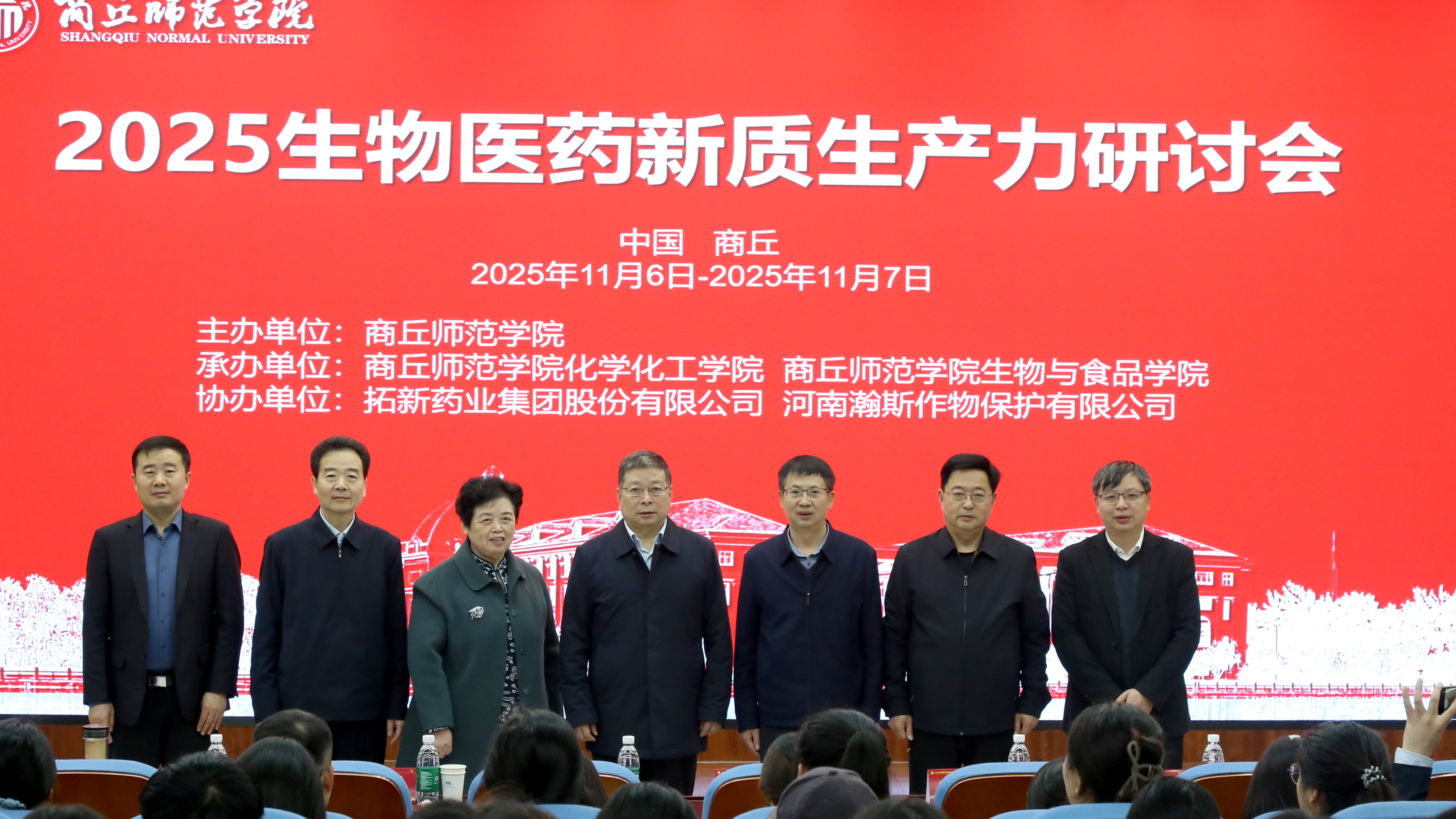11月7日,由我校主办,化学化工学院、生物与食品学院联合承办的“2025生物医药新质生产力研讨会”在睢阳校区工科中心D203报告厅举行。中国科学院院士、郑州大学常俊标教授,河南师范大学渠桂荣教授,以及来自拓新药业集团、河南瀚斯作物保护有限公司的企业代表应邀出席并作专题报告。校党委书记张尚字、校长陈向炜、副校长刘澜涛出席会议,我校180余名师生共同参会,现场学术氛围热烈。