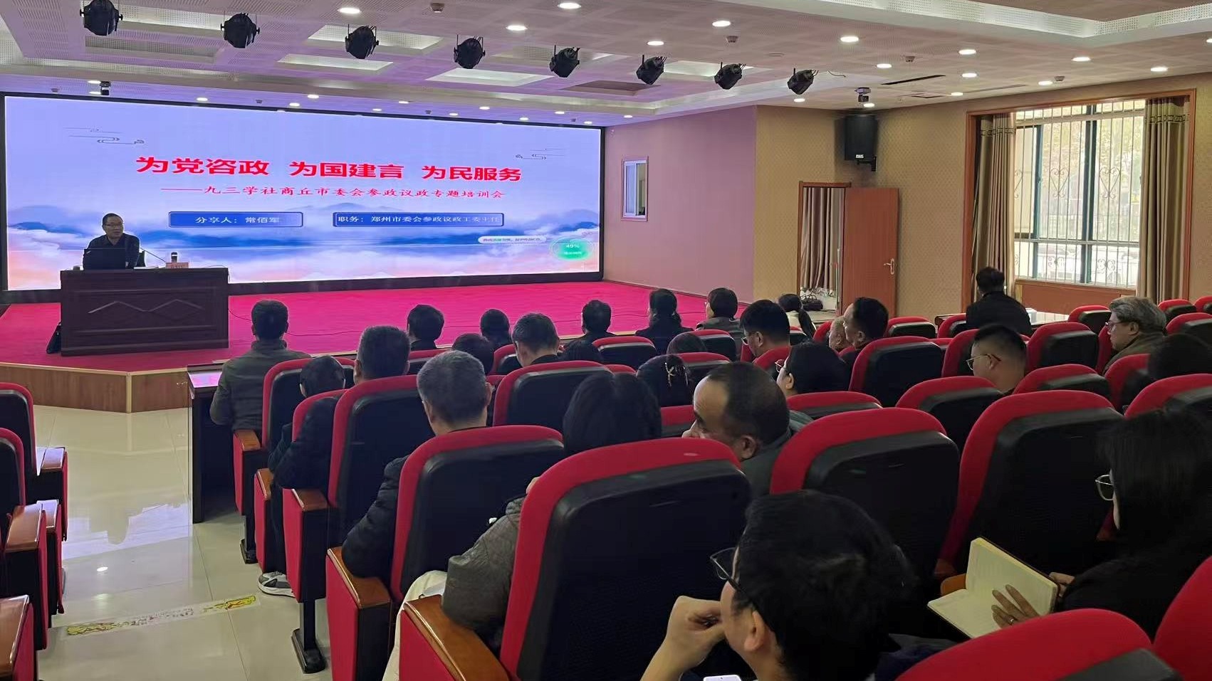 11月14日下午,我校与九三学社商丘市委会联合举办党外人士参政议政能力提升培训会。我校党外人士代表与九三学社商丘市委会委员、各基层组织负责人、社员代表等100余人参加培训。