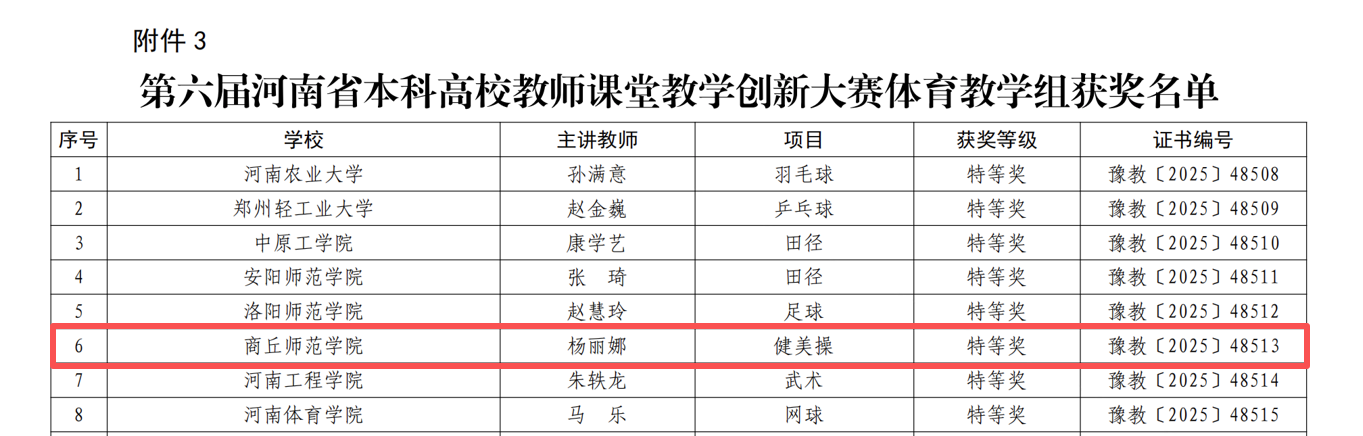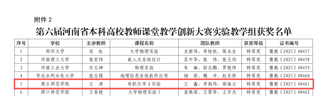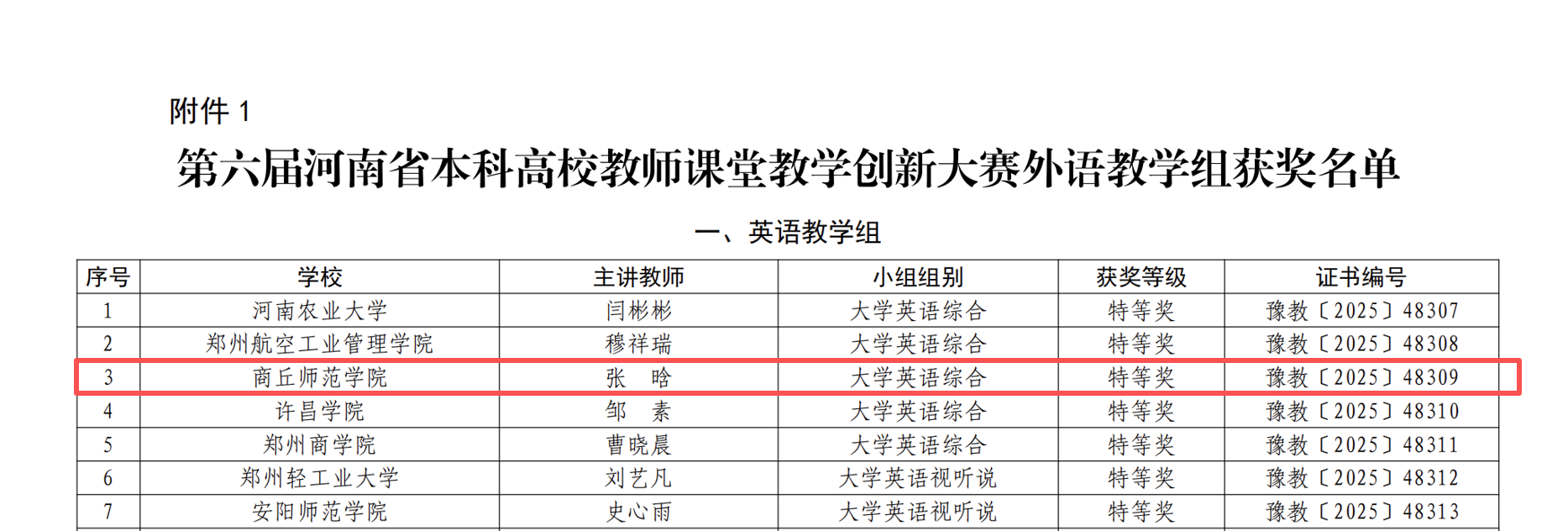 12月1日,第六届河南省本科高校教师课堂教学创新大赛外语教学组、实验教学组、体育教学组获奖名单正式公布。我校外语学院张晗、化学化工学院王涛、体育学院杨丽娜分别荣获各组别特等奖,外语学院王晓燕老师荣获外语教学组二等奖,充分彰显了我校本科教学改革的丰硕成果与教师队伍建设的扎实成效。