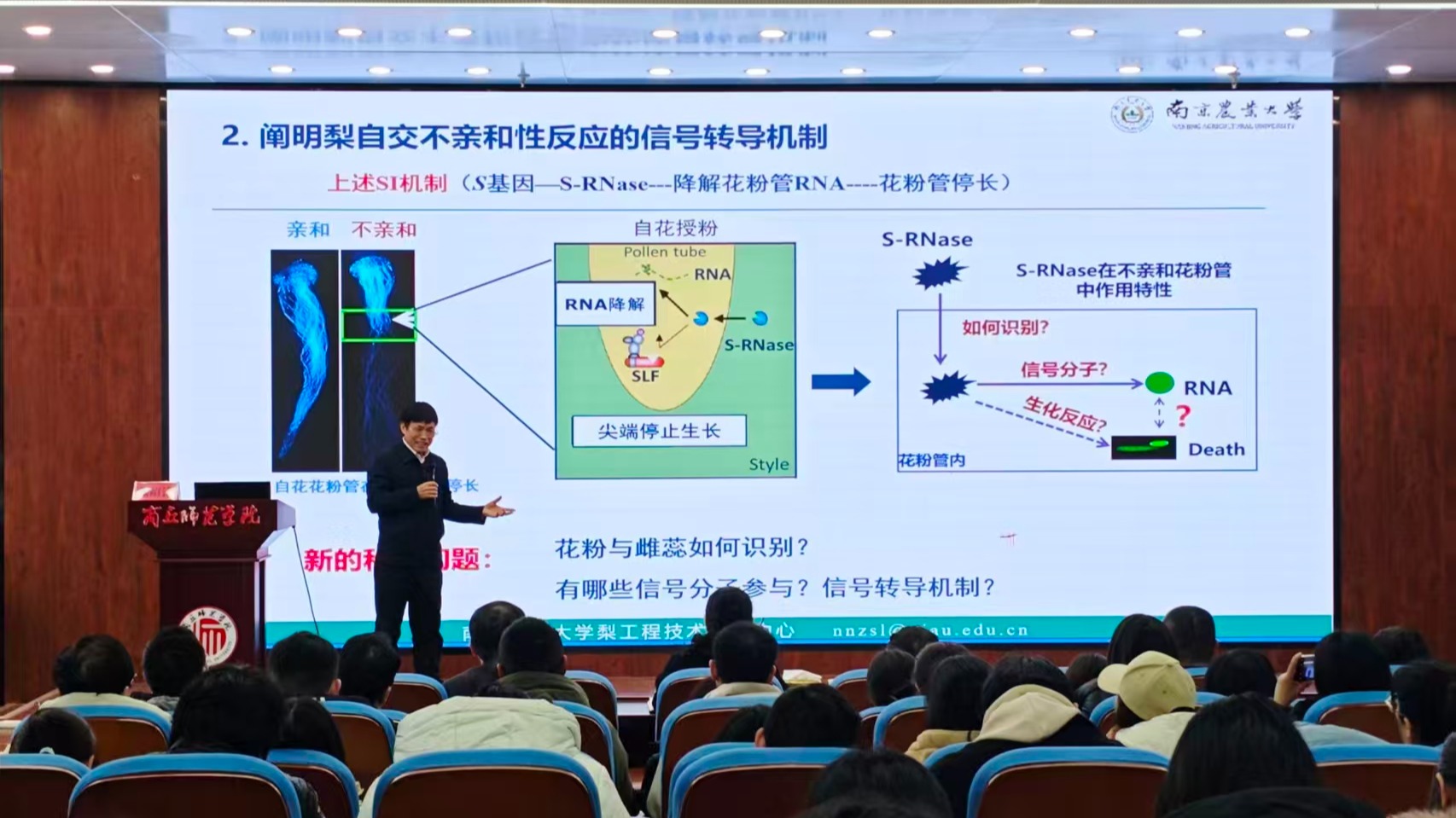 张绍铃院士紧扣习近平总书记提出的“四个面向”战略导向,系统梳理了我国果树产业发展现状与趋势。并结合团队四十余年深耕梨新品种选育的实践经验,他从把握行业发展趋势、精准开展科学选题、推动产学研深度融合、聚焦产业需求服务四个维度,深入阐释了科技创新与产业创新协同共生的实践体会。张院士还进一步以“梨分子遗传基础研究与新品种培育及应用”、“梨自交不亲和性机制研究与授粉方式变革”和“梨轻简化栽培的生理基础与关键技术研发”三大核心研究成果为案例,剖析了从基础科研突破到产业成果转化的完整实现路径,为农业科技成果落地提供了可借鉴的实践范式。
