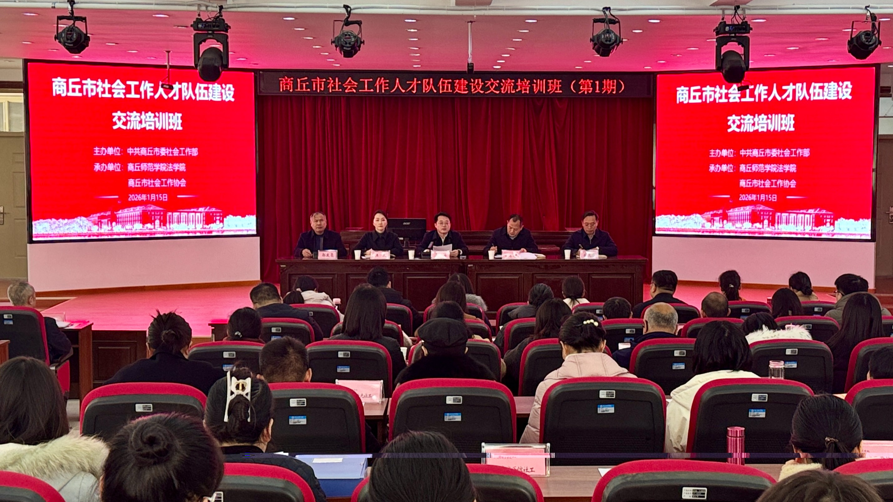 1月15日,商丘市社会工作人才队伍建设交流培训班开班仪式在我校模拟法庭举办。副校长翟滨、商丘市委社会工作部副部长曹思领出席本次培训班开班仪式。