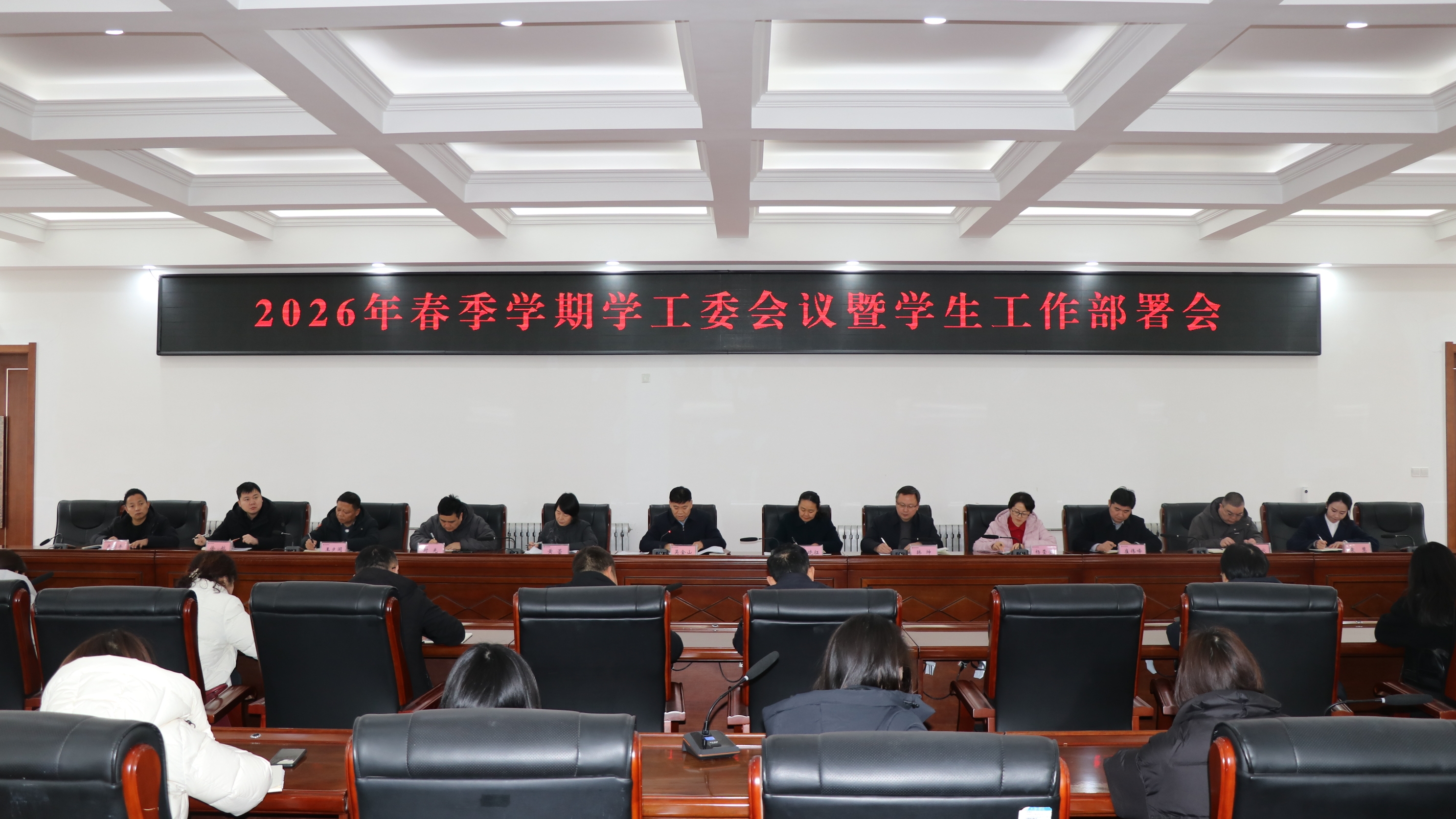 学生处负责同志传达2026年学生工作要点,党委统战部负责同志对统战工作进行安排,保卫处负责同志对安全保卫、反电信诈骗、校园交通管理等工作进行安排,创新创业教育与就业指导服务中心负责同志对访企拓岗、就业宣传等工作进行部署,校团委负责同志对挑战杯、志愿服务、社团纳新等工作进行安排。