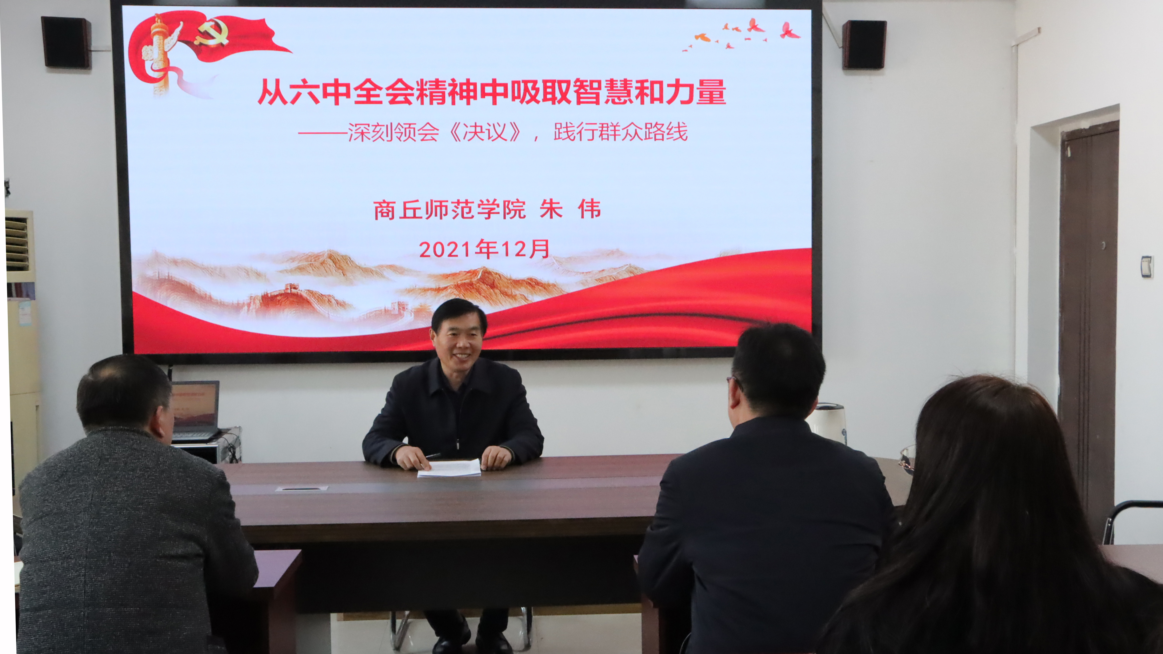为深入学习贯彻党的十九届六中全会精神,持续推动党的十九届六中全会精神融入思政课教学,12月22日,校党委副书记、工会主席朱伟在梁园校区应天楼817会议室为马克思主义学院全体教职工讲授党的十九届六中全会精神专题党课。