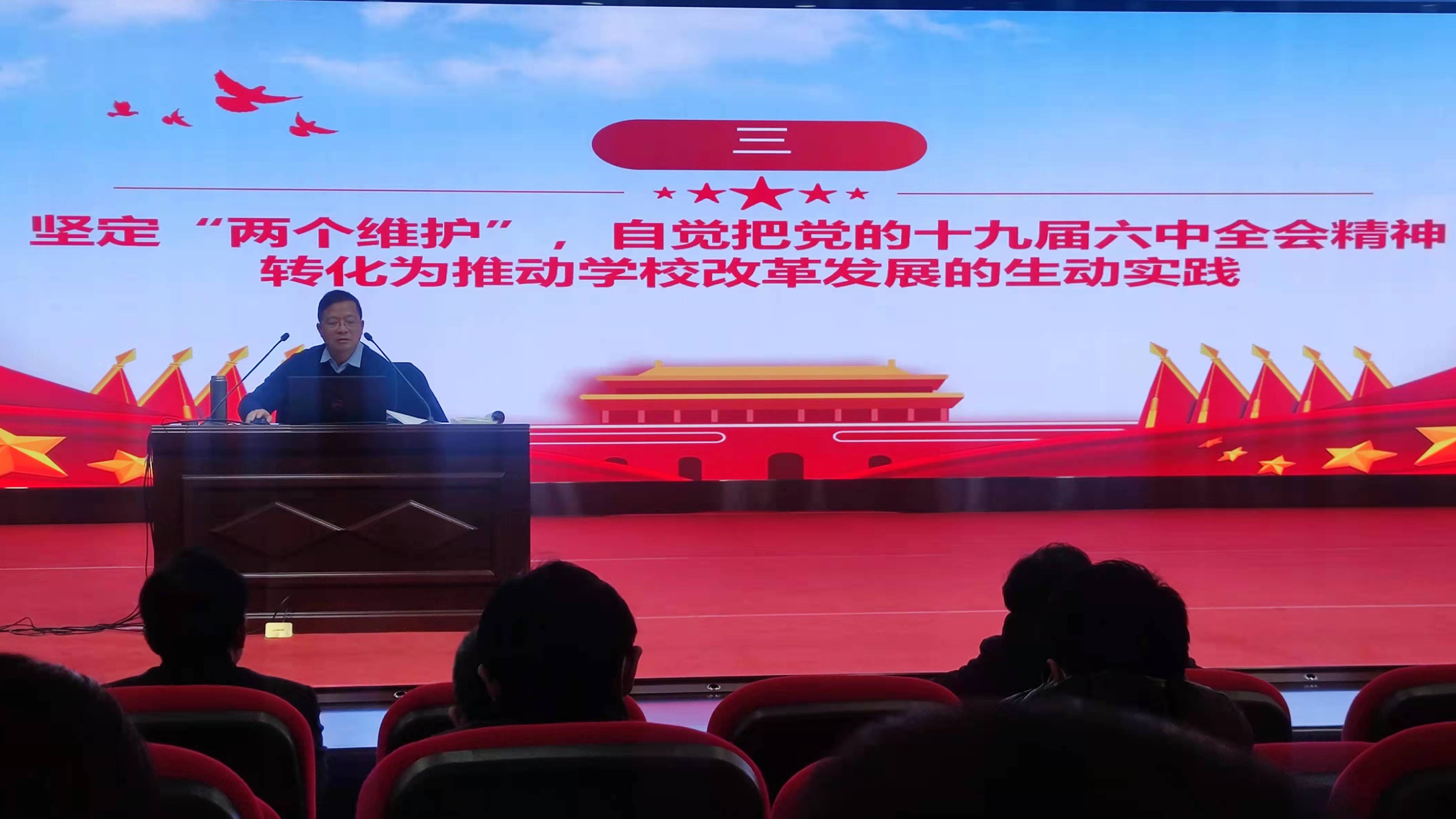 程功鹏以《高举党的思想旗帜汲取百年经验启示 谱写建设高水平应用型大学新篇章》为主题,重点围绕以下三个方面进行讲述:胸怀“两个大局”,深刻领会党的十九届六中全会精神的重大意义;牢记“国之大者”,准确把握党的十九届六中全会精神的丰富内涵和核心要义;做到“两个维护”,自觉把党的十九届六中全会精神转化为推动学校改革发展的生动实践。