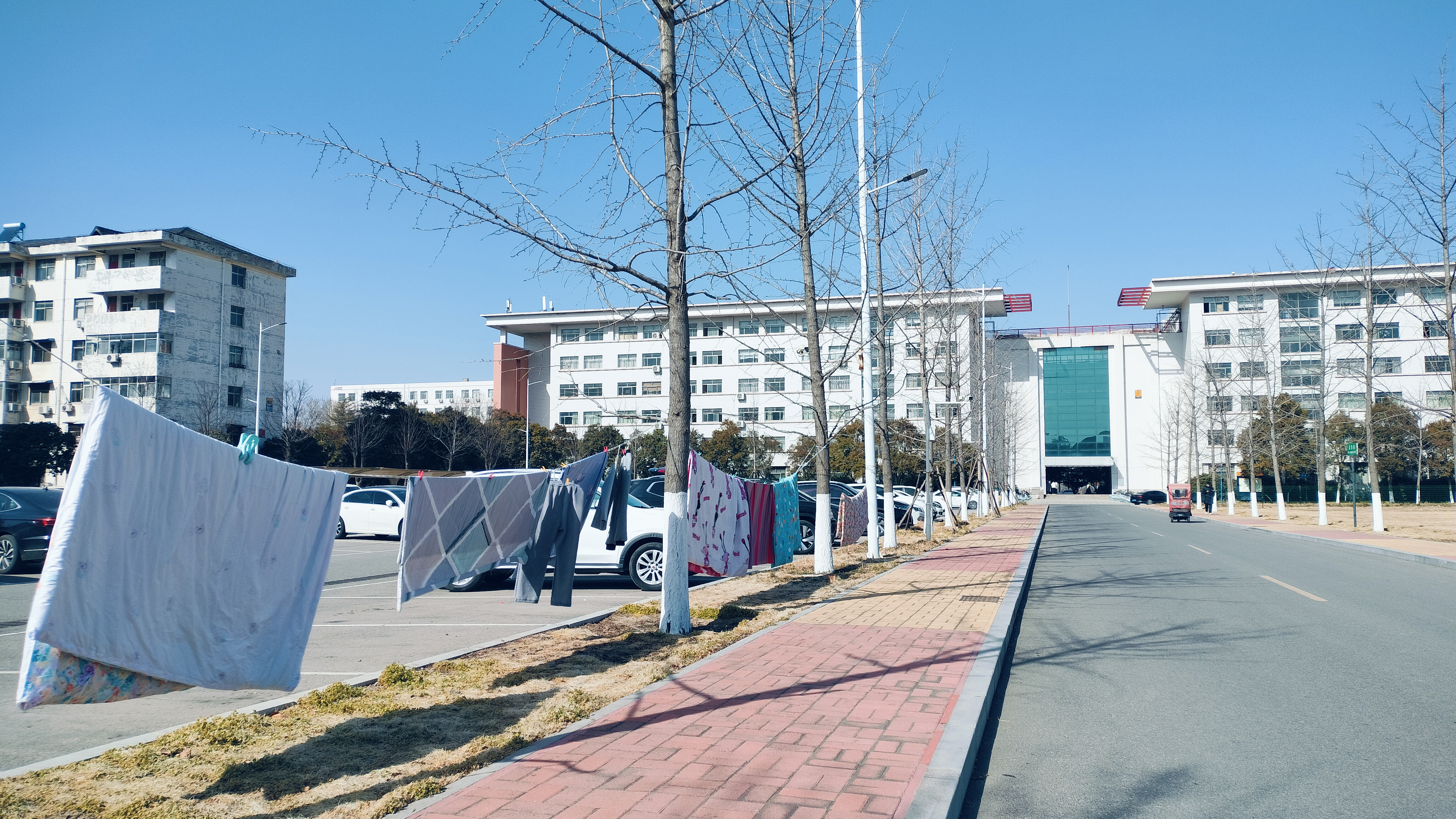 晾晒的被子如云朵般轻盈展开,沐浴在温暖的怀抱中。