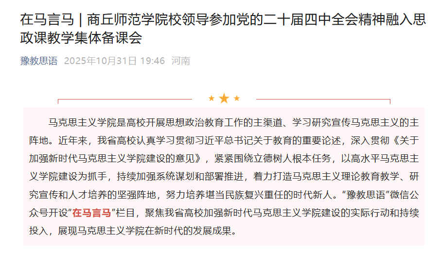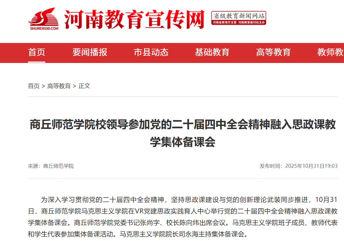 为深入学习贯彻党的二十届四中全会精神,坚持思政课建设与党的创新理论武装同步推进,10月31日,商丘师范学院马克思主义学院在VR党建思政实践育人中心举行党的二十届四中全会精神融入思政课教学集体备课会,被河南教育宣传网、豫教思语报道。