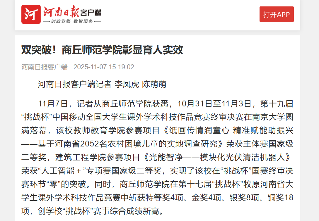 11月7日,河南日报记者从商丘师范学院获悉,10月31日至11月3日,第十九届“挑战杯”中国移动全国大学生课外学术科技作品竞赛终审决赛在南京大学圆满落幕,商丘师范学院教师教育学院参赛项目《纸画传情润童心 精准赋能助振兴——基于河南省2052名农村困境儿童的实地调查研究》荣获主体赛国家级二等奖,建筑工程学院参赛项目《光能智净——模块化光伏清洁机器人》荣获“人工智能+”专项赛国家级二等奖,实现了我校在“挑战杯”国赛终审决赛环节“零”的突破。同时,商丘师范学院在第十七届“挑战杯”牧原河南省大学生课外学术科技作品竞赛中斩获特等奖4项、金奖4项、银奖8项、铜奖18项,创学校“挑战杯”赛事综合成绩新高。