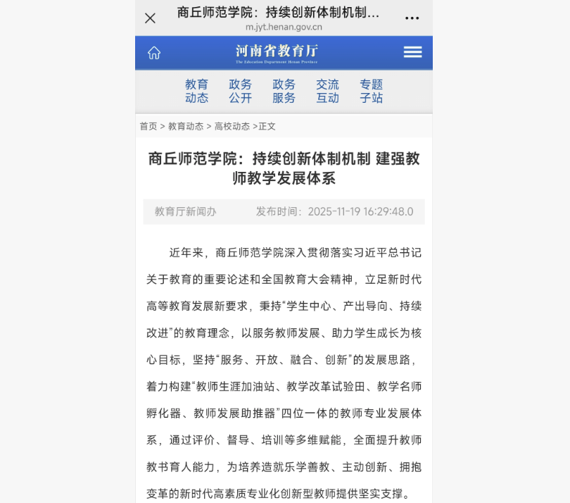 近年来,商丘师范学院深入贯彻落实习近平总书记关于教育的重要论述和全国教育大会精神,立足新时代高等教育发展新要求,秉持“学生中心、产出导向、持续改进”的教育理念,以服务教师发展、助力学生成长为核心目标,坚持“服务、开放、融合、创新”的发展思路,着力构建“教师生涯加油站、教学改革试验田、教学名师孵化器、教师发展助推器”四位一体的教师专业发展体系,通过评价、督导、培训等多维赋能,全面提升教师教书育人能力,为培养造就乐学善教、主动创新、拥抱变革的新时代高素质专业化创新型教师提供坚实支撑。