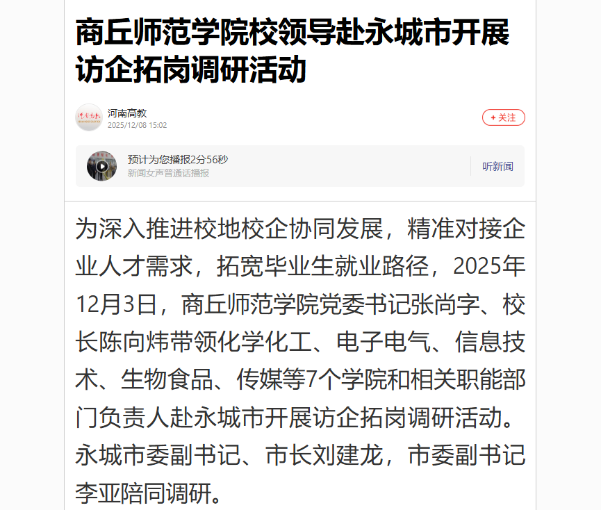 为深入推进校地校企协同发展,精准对接企业人才需求,拓宽毕业生就业路径,2025年12月3日,商丘师范学院党委书记张尚字、校长陈向炜带领化学化工、电子电气、信息技术、生物食品、传媒等7个学院和相关职能部门负责人赴永城市开展访企拓岗调研活动。永城市委副书记、市长刘建龙,市委副书记李亚陪同调研,被河南高教专题报道。