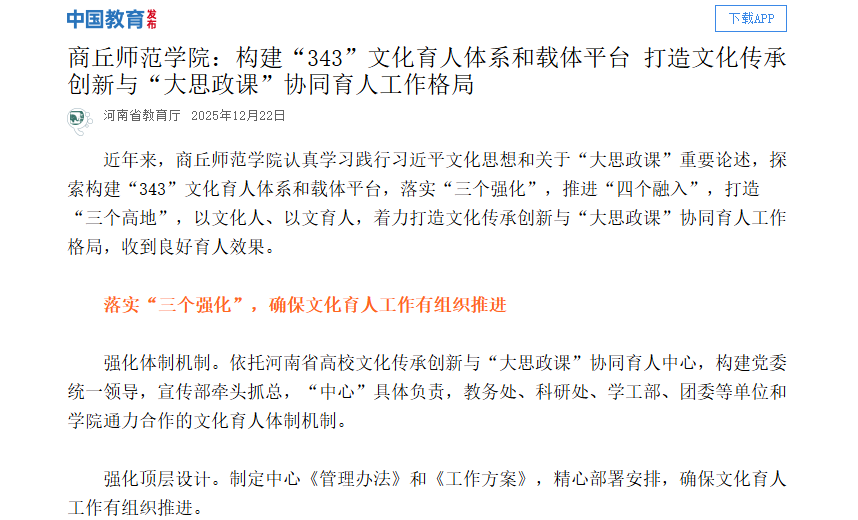 近日,河南省教育厅推介我校构建“343”文化育人体系和载体平台 打造文化传承创新与“大思政课”协同育人工作格局。文中指出,近年来,商丘师范学院认真学习践行习近平文化思想和关于“大思政课”重要论述,探索构建“343”文化育人体系和载体平台,落实“三个强化”,推进“四个融入”,打造“三个高地”,以文化人、以文育人,着力打造文化传承创新与“大思政课”协同育人工作格局,收到良好育人效果。