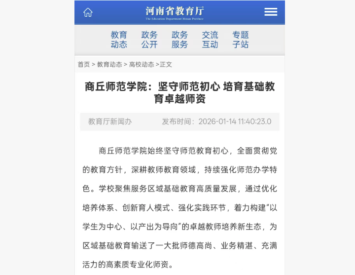近日,河南省教育厅推介我校坚守师范初心 培育基础教育卓越师资,文中指出,商丘师范学院始终坚守师范教育初心,全面贯彻党的教育方针,深耕教师教育领域,持续强化师范办学特色。学校聚焦服务区域基础教育高质量发展,通过优化培养体系、创新育人模式、强化实践环节,着力构建“以学生为中心、以产出为导向”的卓越教师培养新生态,为区域基础教育输送了一大批师德高尚、业务精湛、充满活力的高素质专业化师资。
